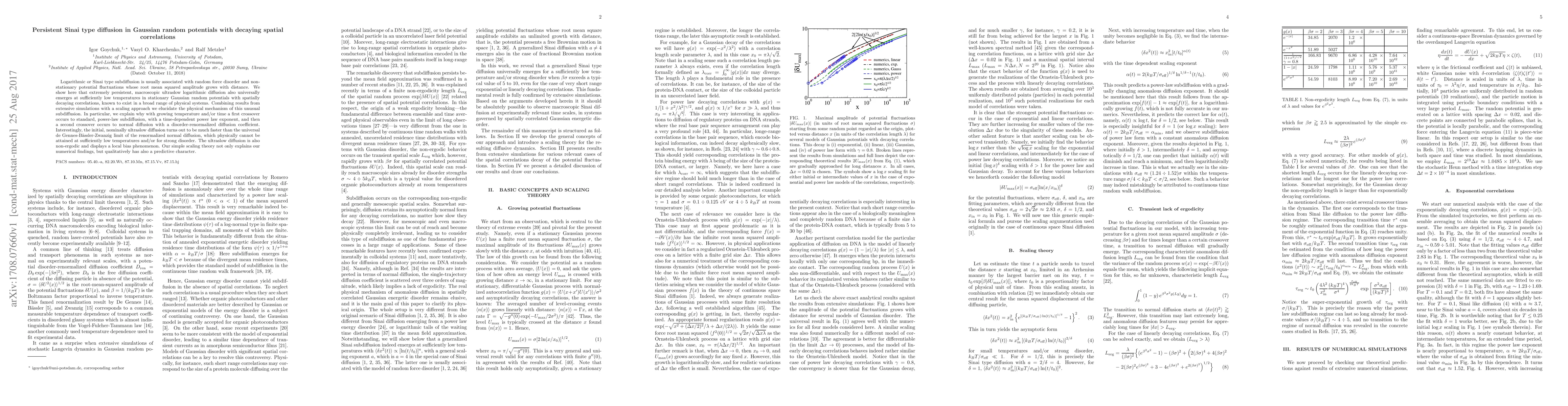 This paper demonstrates persistent Sinai type subdiffusion in Gaussian random potentials with decaying spatial correlations, revealing an ultraslow logarithmic diffusion at low temperatures. It explains the transition from ultraslow to power-law subdiffusion and eventually to normal diffusion, highlighting the non-ergodic nature and local bias phenomenon of the initial diffusion.