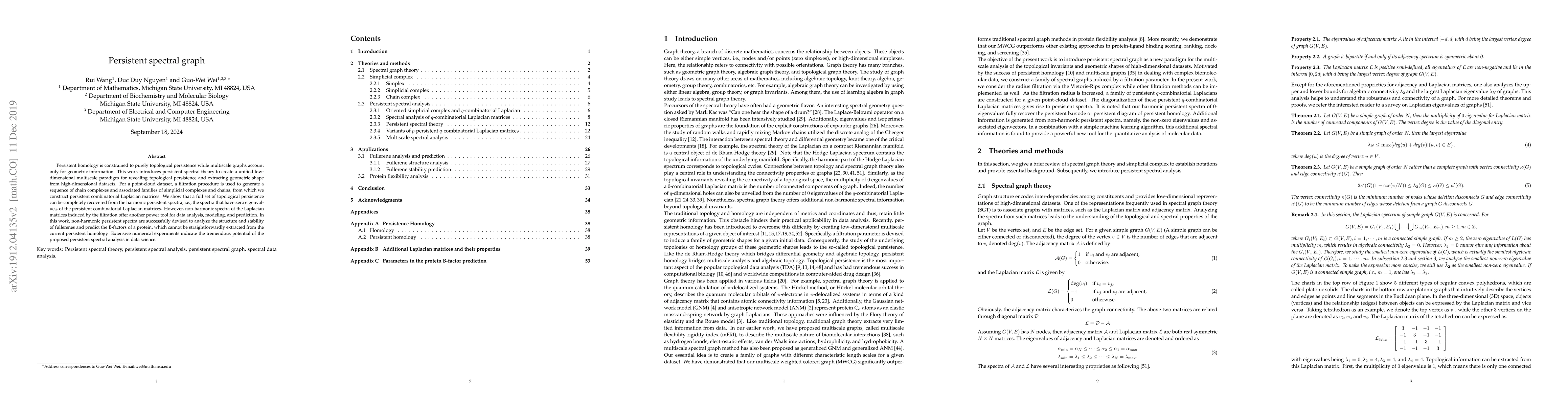 This paper introduces persistent spectral theory to unify topological persistence and geometric shape analysis in high-dimensional datasets. It demonstrates that topological persistence can be recovered from the harmonic spectra of persistent combinatorial Laplacian matrices, while non-harmonic spectra provide additional tools for data analysis and prediction, as shown in applications to fullerenes and protein B-factors.