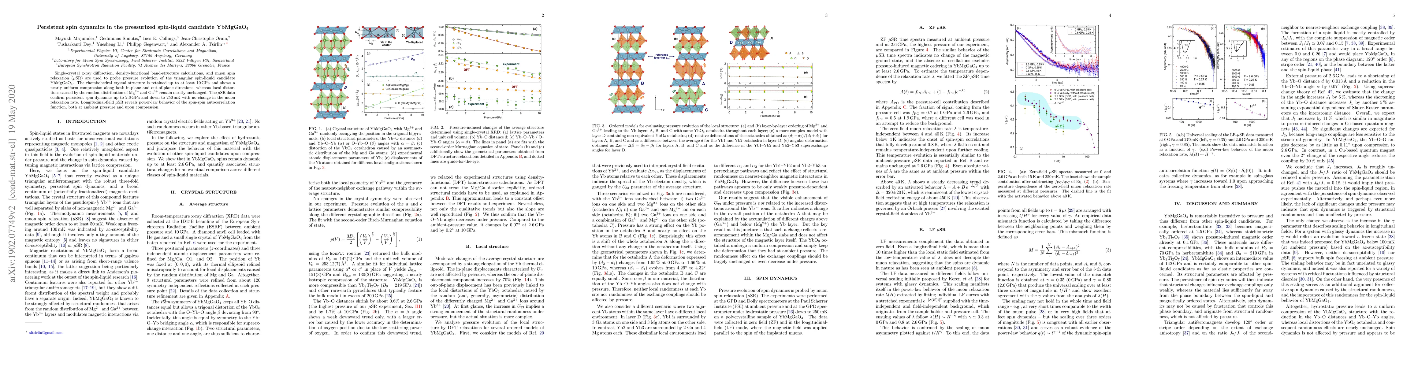 Single-crystal x-ray diffraction, density-functional band-structure calculations, and muon spin relaxation ($\mu$SR) are used to probe pressure evolution of the triangular spin-liquid candidate YbMgGaO$_4$. The rhombohedral crystal structure is retained up to at least 10 GPa and shows a nearly uniform compression along both in-plane and out-of-plane directions, whereas local distortions caused by the random distribution of Mg$^{2+}$ and Ga$^{3+}$ remain mostly unchanged. The $\mu$SR data confirm persistent spin dynamics up to 2.6 GPa and down to 250 mK with no change in the muon relaxation rate. Longitudinal-field $\mu$SR reveals power-law behavior of the spin-spin autocorrelation function, both at ambient pressure and upon compression.