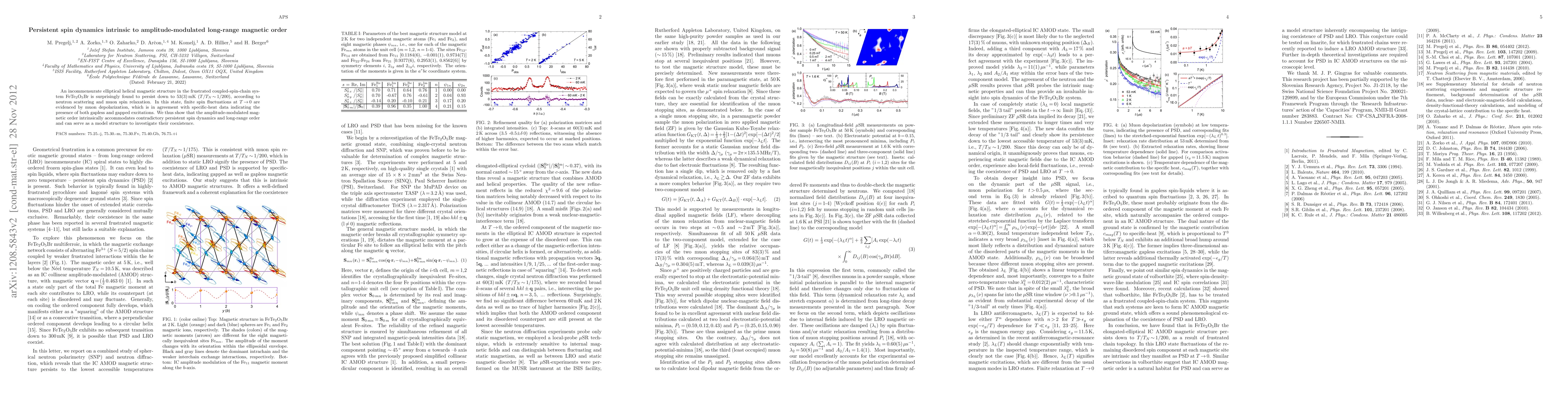An incommensurate elliptical helical magnetic structure in the frustrated coupled-spin-chain system FeTe2O5Br is surprisingly found to persist down to 53(3) mK (T/T_N ~ 1/200), according to neutron scattering and muon spin relaxation. In this state, finite spin fluctuations at T -> 0 are evidenced by muon depolarization, which is in agreement with specific-heat data indicating the presence of both gapless and gapped excitations. We thus show that the amplitude-modulated magnetic order intrinsically accommodates contradictory persistent spin dynamics and long-range order and can serve as a model structure to investigate their coexistence.