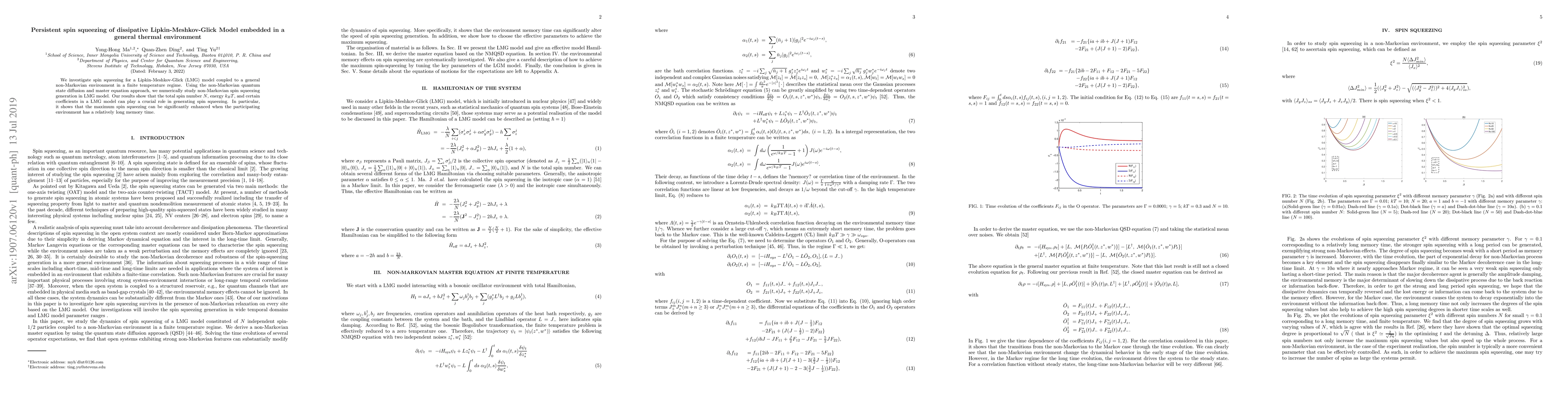 This paper investigates spin squeezing in a dissipative Lipkin-Meshkov-Glick (LMG) model embedded in a non-Markovian thermal environment. The study reveals that factors like total spin number, temperature, and memory time of the environment significantly enhance spin squeezing, especially with longer memory times.
