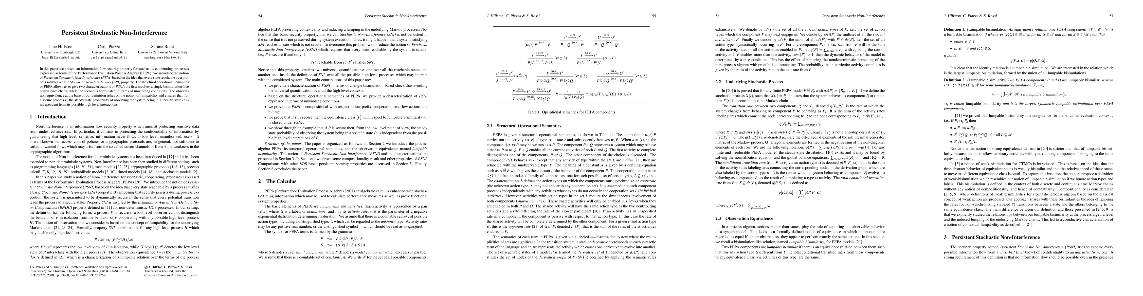 In this paper we present an information flow security property for stochastic, cooperating, processes expressed as terms of the Performance Evaluation Process Algebra (PEPA). We introduce the notion of Persistent Stochastic Non-Interference (PSNI) based on the idea that every state reachable by a process satisfies a basic Stochastic Non-Interference (SNI) property. The structural operational semantics of PEPA allows us to give two characterizations of PSNI: the first involves a single bisimulation-like equivalence check, while the second is formulated in terms of unwinding conditions. The observation equivalence at the base of our definition relies on the notion of lumpability and ensures that, for a secure process P, the steady state probability of observing the system being in a specific state P' is independent from its possible high level interactions.