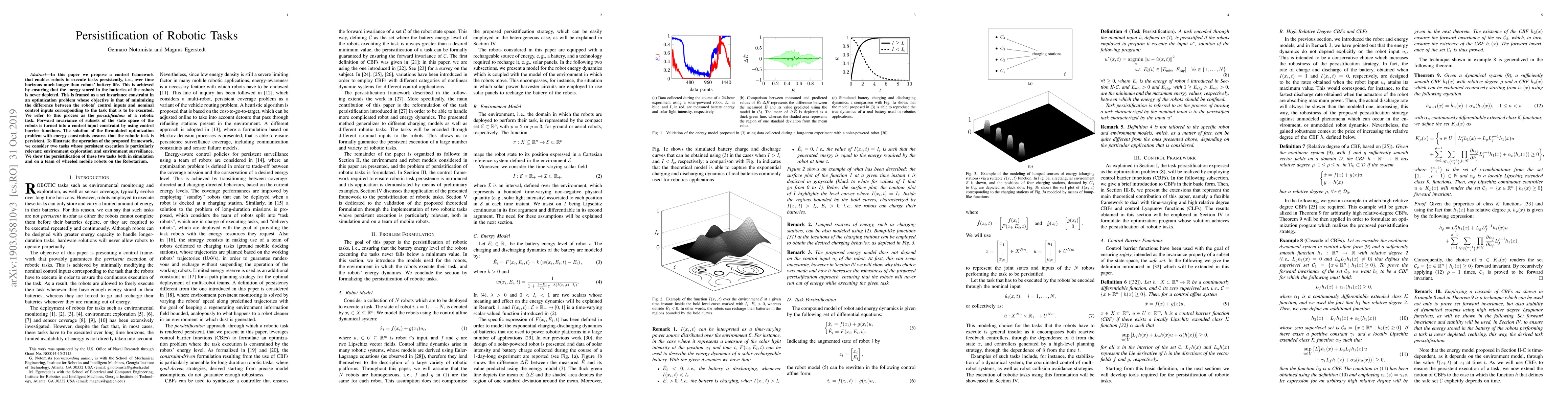 In this paper we propose a control framework that enables robots to execute tasks persistently, i.e., over time horizons much longer than robots' battery life. This is achieved by ensuring that the energy stored in the batteries of the robots is never depleted. This is framed as a set invariance constraint in an optimization problem whose objective is that of minimizing the difference between the robots' control inputs and nominal control inputs corresponding to the task that is to be executed. We refer to this process as the persistification of a robotic task. Forward invariance of subsets of the state space of the robots is turned into a control input constraint by using control barrier functions. The solution of the formulated optimization problem with energy constraints ensures that the robotic task is persistent. To illustrate the operation of the proposed framework, we consider two tasks whose persistent execution is particularly relevant: environment exploration and environment surveillance. We show the persistification of these two tasks both in simulation and on a team of wheeled mobile robots on the Robotarium.