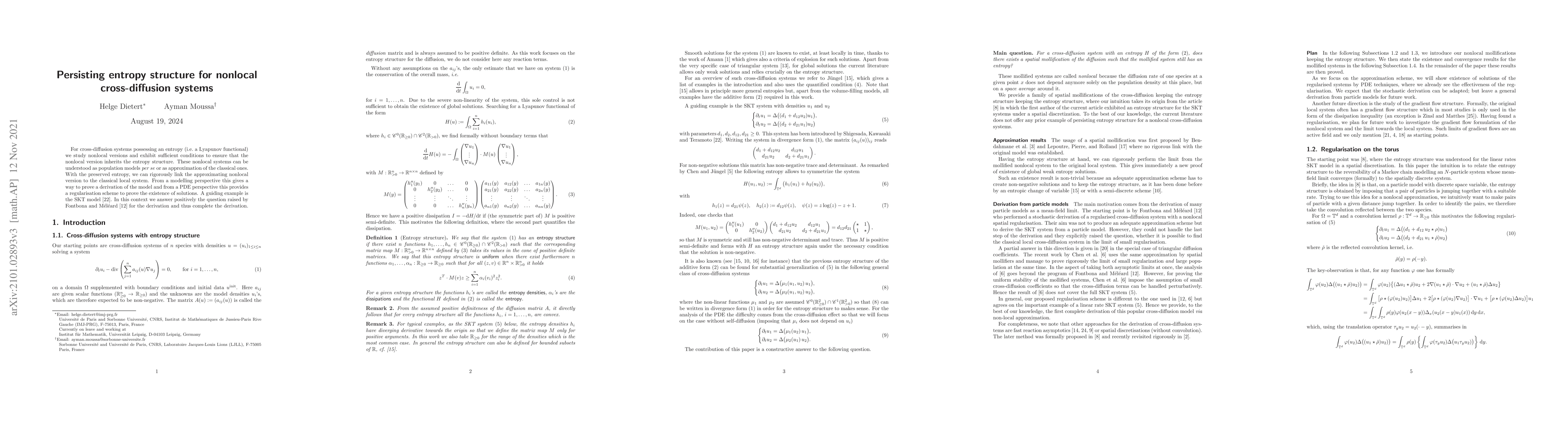 For cross-diffusion systems possessing an entropy (i.e. a Lyapunov functional)we study nonlocal versions and exhibit sufficient conditions to ensure that thenonlocal version inherits the entropy structure. These nonlocal systems can beunderstood as population models per se or as approximation of the classical ones.With the preserved entropy, we can rigorously link the approximating nonlocalversion to the classical local system. From a modelling perspective this gives away to prove a derivation of the model and from a PDE perspective this providesa regularisation scheme to prove the existence of solutions. A guiding example isthe SKT model [22]. In this context we answer positively the question raised byFontbona and M{\'e}l{\'e}ard [12] for the derivation and thus complete the derivation.