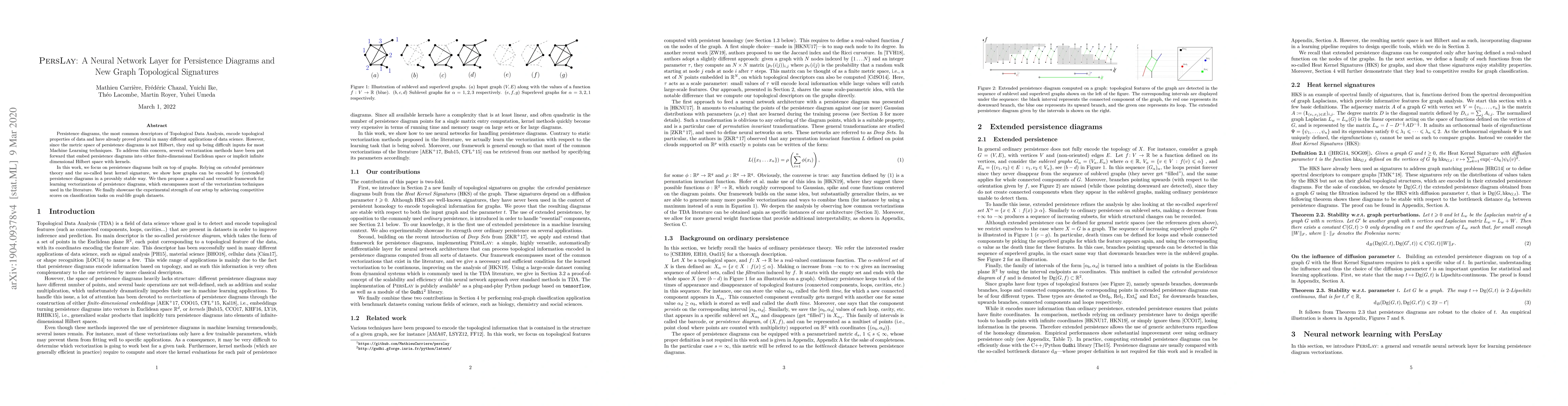 This paper introduces PersLay, a neural network layer for encoding persistence diagrams derived from graphs, addressing the challenge of non-Hilbert space inputs in machine learning. It leverages extended persistence theory and heat kernel signatures to provide stable graph encodings, and demonstrates competitive performance on graph classification tasks.