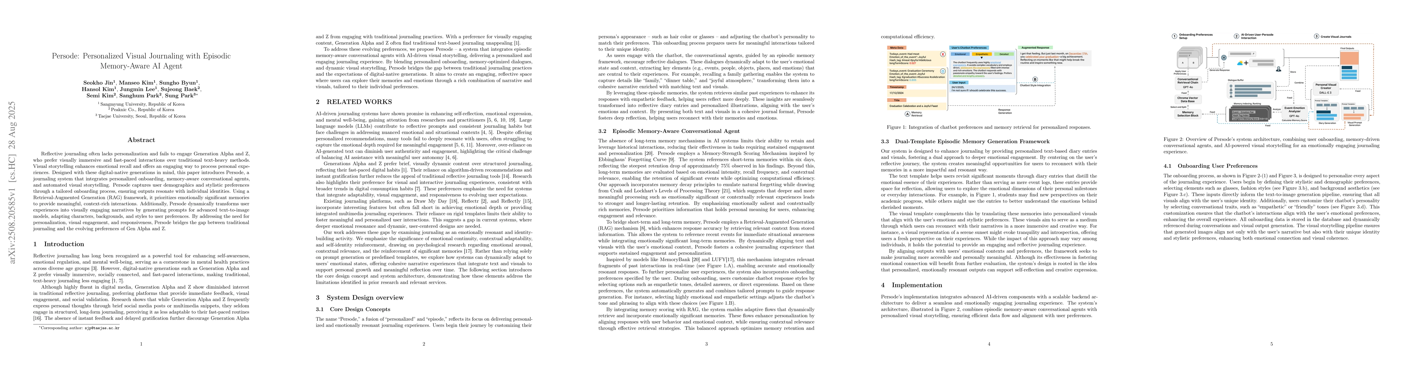 Reflective journaling often lacks personalization and fails to engage Generation Alpha and Z, who prefer visually immersive and fast-paced interactions over traditional text-heavy methods. Visual storytelling enhances emotional recall and offers an engaging way to process personal expe- riences. Designed with these digital-native generations in mind, this paper introduces Persode, a journaling system that integrates personalized onboarding, memory-aware conversational agents, and automated visual storytelling. Persode captures user demographics and stylistic preferences through a tailored onboarding process, ensuring outputs resonate with individual identities. Using a Retrieval-Augmented Generation (RAG) framework, it prioritizes emotionally significant memories to provide meaningful, context-rich interactions. Additionally, Persode dynamically transforms user experiences into visually engaging narratives by generating prompts for advanced text-to-image models, adapting characters, backgrounds, and styles to user preferences. By addressing the need for personalization, visual engagement, and responsiveness, Persode bridges the gap between traditional journaling and the evolving preferences of Gen Alpha and Z.