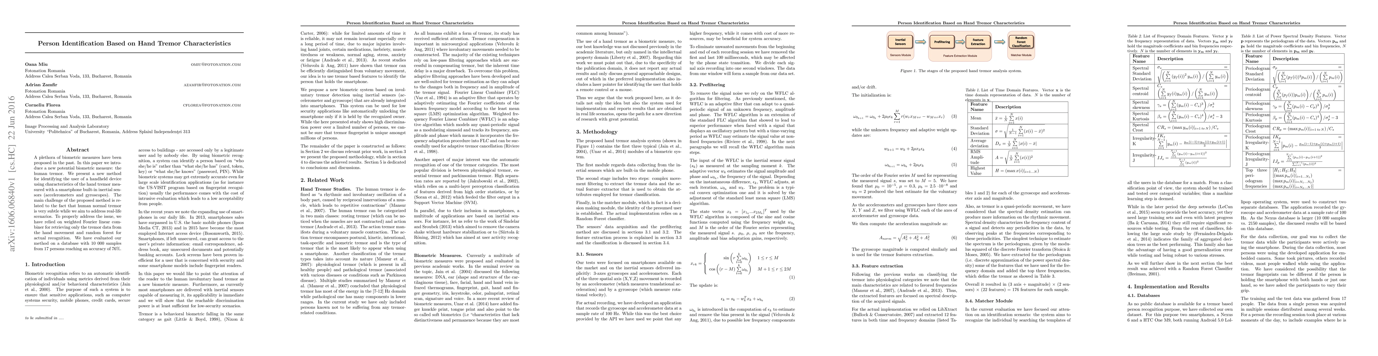 This paper proposes a novel biometric method for identifying individuals based on unique hand tremor characteristics, measured using smartphone inertial sensors. The method employs a weighted Fourier linear combiner and random forest classifier to achieve 76% accuracy on a dataset of 10,000 samples from 17 individuals.