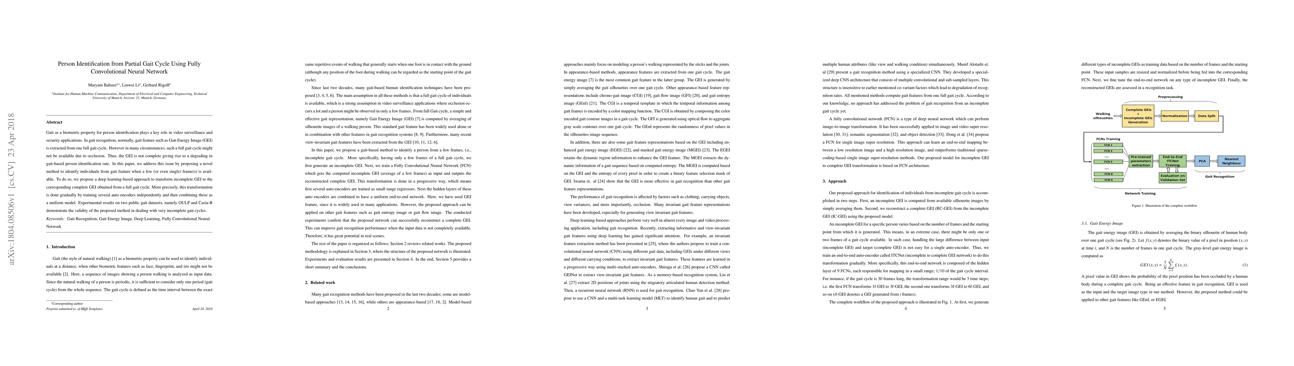 This paper proposes a fully convolutional neural network to identify individuals from incomplete gait cycles, transforming incomplete Gait Energy Images (GEI) into complete GEI through a series of trained autoencoders. Experimental results on OULP and Casia-B datasets show the method's effectiveness in handling partial gait data.