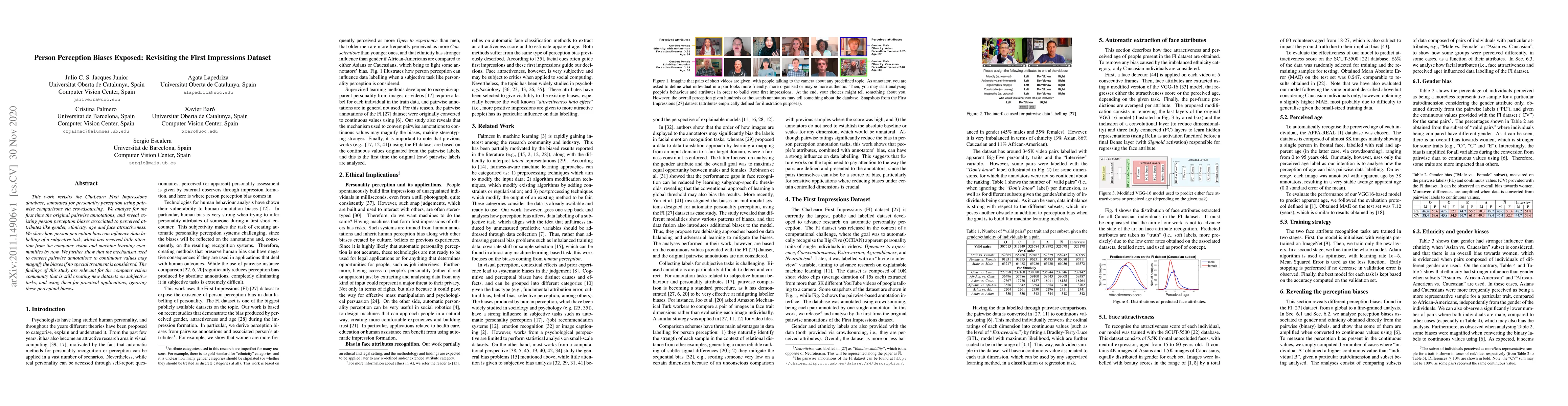 Researchers analyzed the ChaLearn First Impressions dataset to reveal biases in person perception, finding that attributes like gender and face attractiveness can influence data labeling, and that these biases may magnify if not addressed.