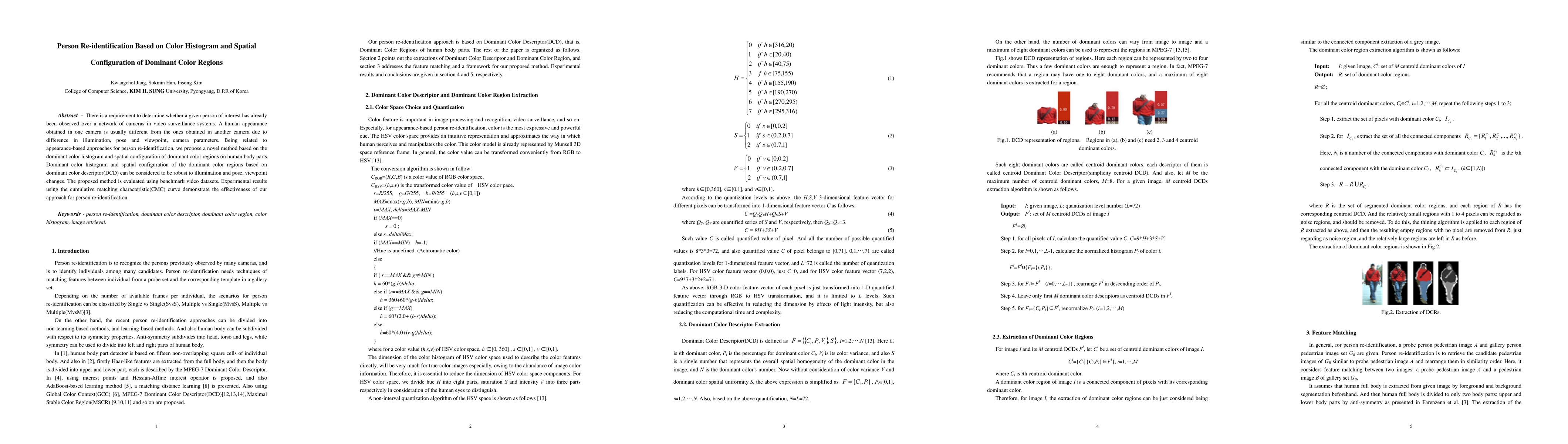 This paper proposes a novel method for person re-identification in video surveillance systems using a dominant color histogram and spatial configuration of dominant color regions. The method is shown to be robust to changes in illumination, pose, and viewpoint, and demonstrates effectiveness through benchmark dataset evaluations.