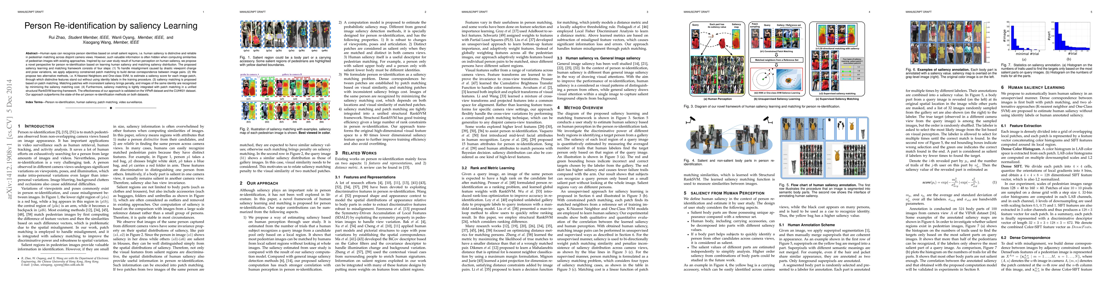 This paper proposes a novel person re-identification method based on learning human saliency and matching saliency distribution, which is validated to outperform existing methods on VIPeR and CUHK01 datasets. The approach involves adjacency constrained patch matching, saliency score estimation, saliency matching, and a unified structural RankSVM learning framework.