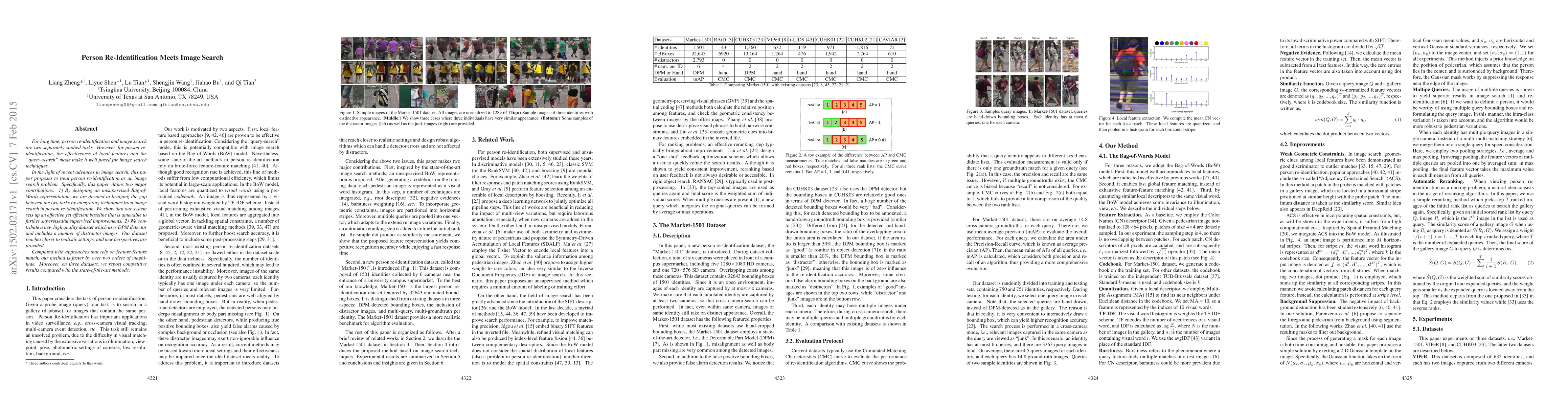 This paper proposes treating person re-identification as an image search problem, leveraging image search techniques to enhance re-identification. It introduces an unsupervised Bag-of-Words representation and a new high-quality dataset, achieving faster and competitive results compared to traditional methods.