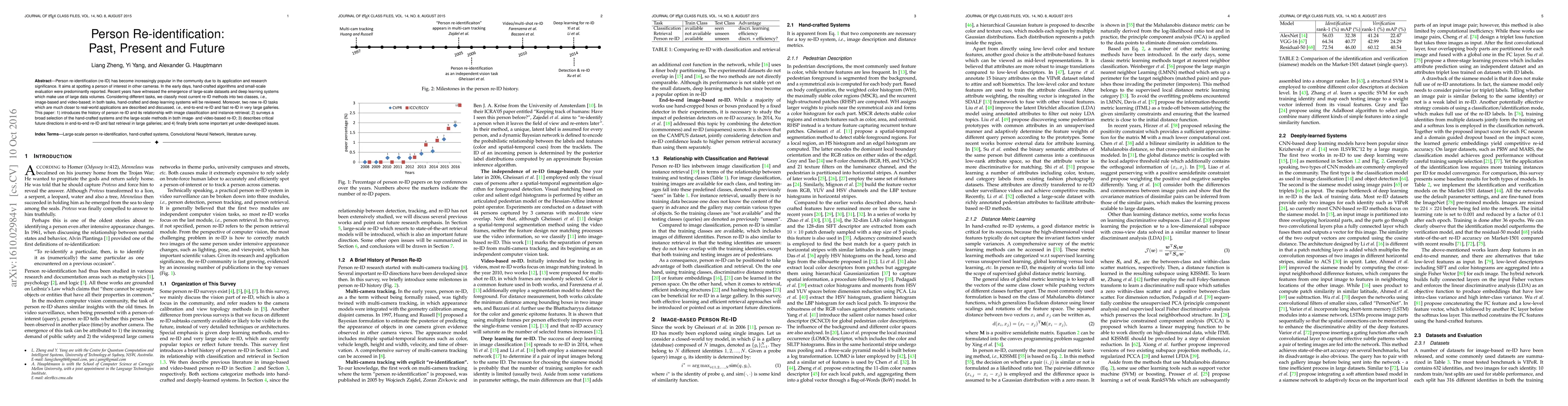 This paper provides a comprehensive review of person re-identification (re-ID) techniques, tracing their evolution from early hand-crafted methods to modern deep learning approaches. It also explores future directions, including end-to-end re-ID and fast retrieval in large galleries, alongside under-developed issues in the field.