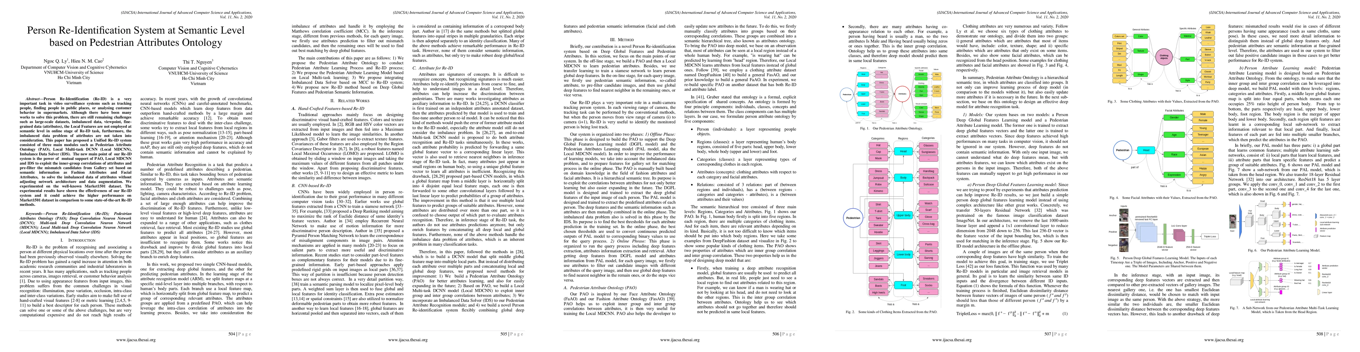 Person Re-Identification (Re-ID) is a very important task in video surveillance systems such as tracking people, finding people in public places, or analysing customer behavior in supermarkets. Although there have been many works to solve this problem, there are still remaining challenges such as large-scale datasets, imbalanced data, viewpoint, fine grained data (attributes), the Local Features are not employed at semantic level in online stage of Re-ID task, furthermore, the imbalanced data problem of attributes are not taken into consideration. This paper has proposed a Unified Re-ID system consisted of three main modules such as Pedestrian Attribute Ontology (PAO), Local Multi-task DCNN (Local MDCNN), Imbalance Data Solver (IDS). The new main point of our Re-ID system is the power of mutual support of PAO, Local MDCNN and IDS to exploit the inner-group correlations of attributes and pre-filter the mismatch candidates from Gallery set based on semantic information as Fashion Attributes and Facial Attributes, to solve the imbalanced data of attributes without adjusting network architecture and data augmentation. We experimented on the well-known Market1501 dataset. The experimental results have shown the effectiveness of our Re-ID system and it could achieve the higher performance on Market1501 dataset in comparison to some state-of-the-art Re-ID methods.