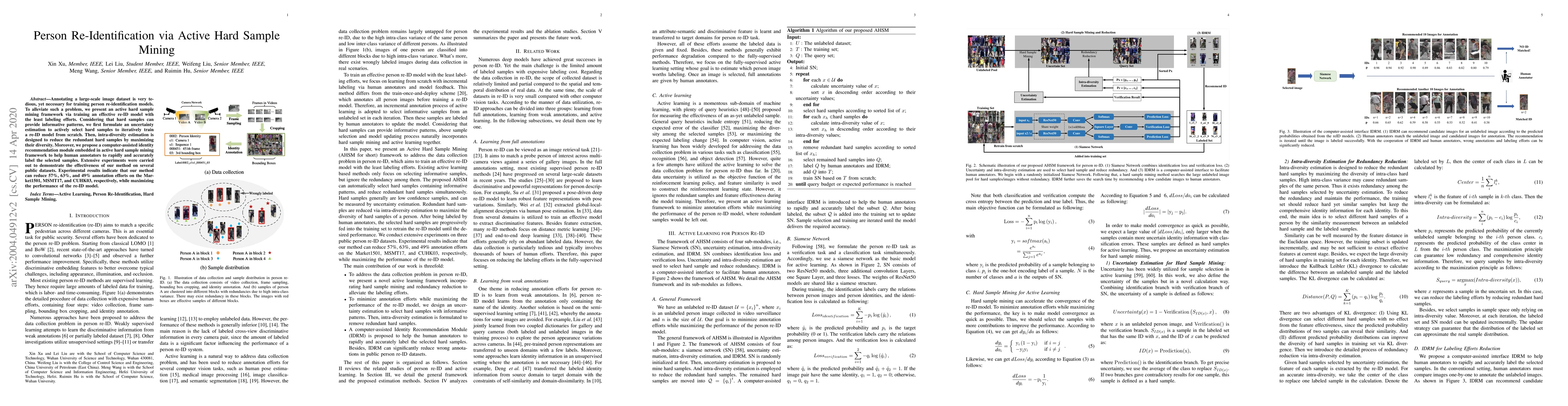 This paper proposes an active hard sample mining framework to reduce annotation efforts in training person re-identification models. It uses uncertainty estimation to select informative hard samples and intra-diversity estimation to maximize sample diversity, while also incorporating a computer-assisted identity recommendation module to aid human annotators. The method significantly reduces annotation efforts by 57%, 63%, and 49% on three datasets while maintaining high model performance.