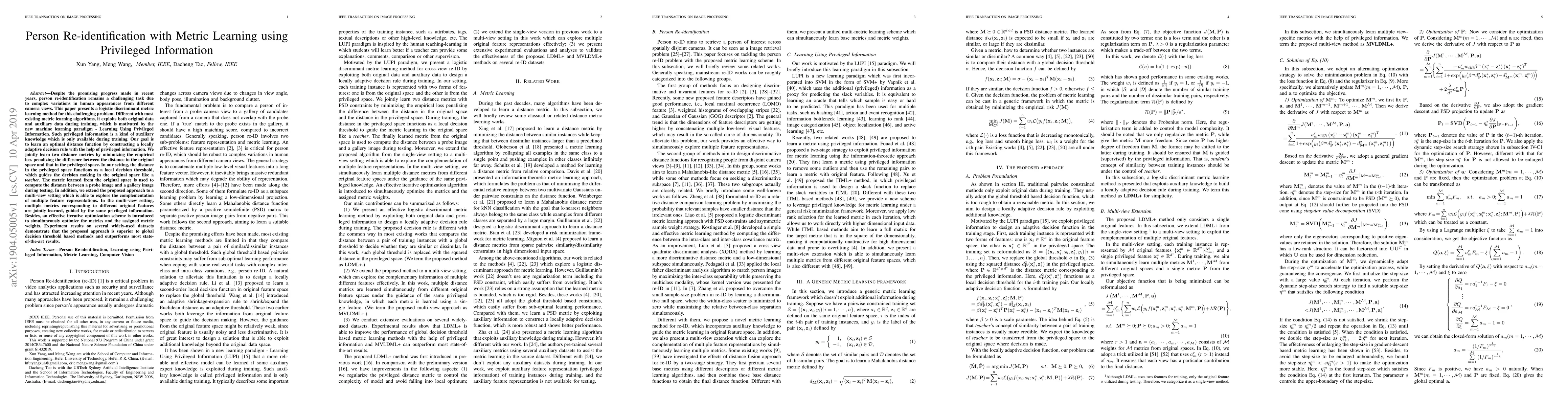 The paper presents a logistic discriminant metric learning method for person re-identification using both original data and auxiliary data (privileged information) during training, guided by the Learning Using Privileged Information paradigm. The approach jointly learns two distance metrics to minimize the empirical loss penalizing the difference between distances in the original and privileged spaces.