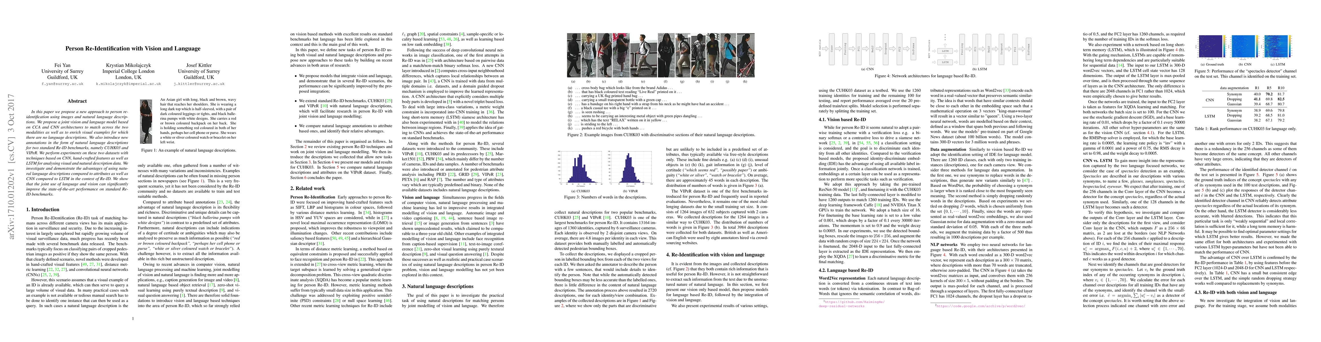 In this paper we propose a new approach to person re-identification using images and natural language descriptions. We propose a joint vision and language model based on CCA and CNN architectures to match across the two modalities as well as to enrich visual examples for which there are no language descriptions. We also introduce new annotations in the form of natural language descriptions for two standard Re-ID benchmarks, namely CUHK03 and VIPeR. We perform experiments on these two datasets with techniques based on CNN, hand-crafted features as well as LSTM for analysing visual and natural description data. We investigate and demonstrate the advantages of using natural language descriptions compared to attributes as well as CNN compared to LSTM in the context of Re-ID. We show that the joint use of language and vision can significantly improve the state-of-the-art performance on standard Re-ID benchmarks.
