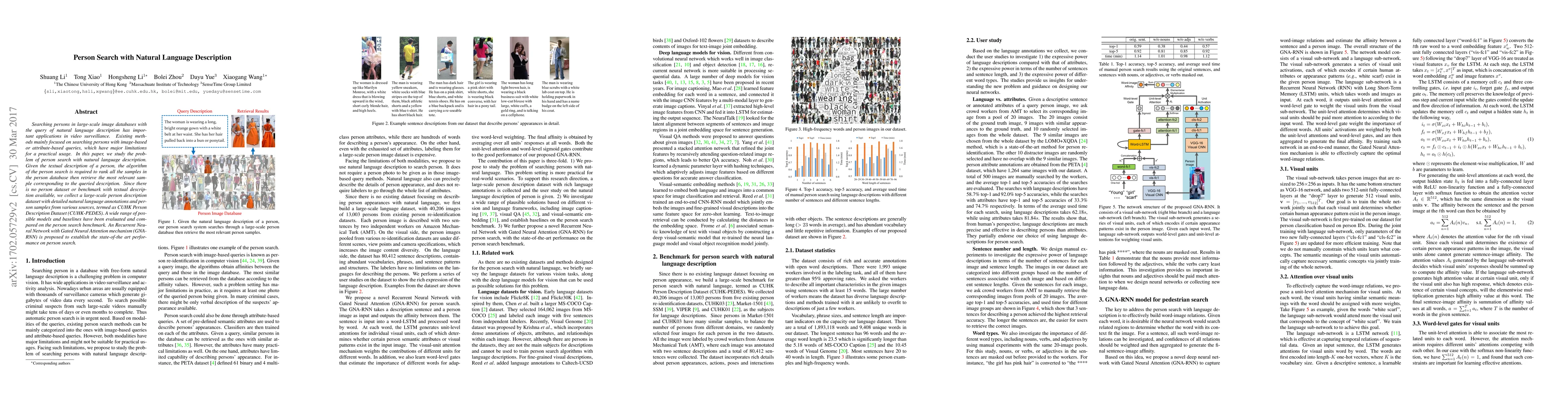 This paper introduces a method for person search using natural language descriptions, addressing the limitations of existing image-based methods. It presents a new dataset, CUHK Person Description Dataset (CUHK-PEDES), and proposes a GNA-RNN model to achieve state-of-the-art performance in ranking and retrieving the most relevant person images based on textual descriptions.