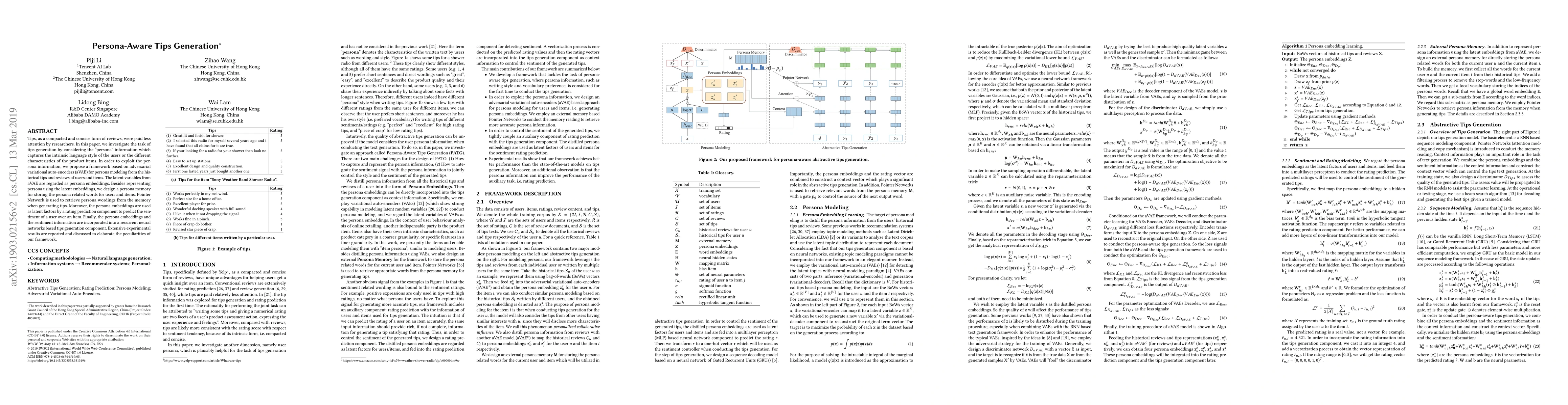 This paper proposes a framework for generating persona-aware tips using adversarial variational auto-encoders to model persona embeddings from historical tips and reviews, and employs a persona memory and pointer network for generating personalized tips, integrating sentiment prediction for enhanced relevance. Experimental results demonstrate the effectiveness of the proposed approach.