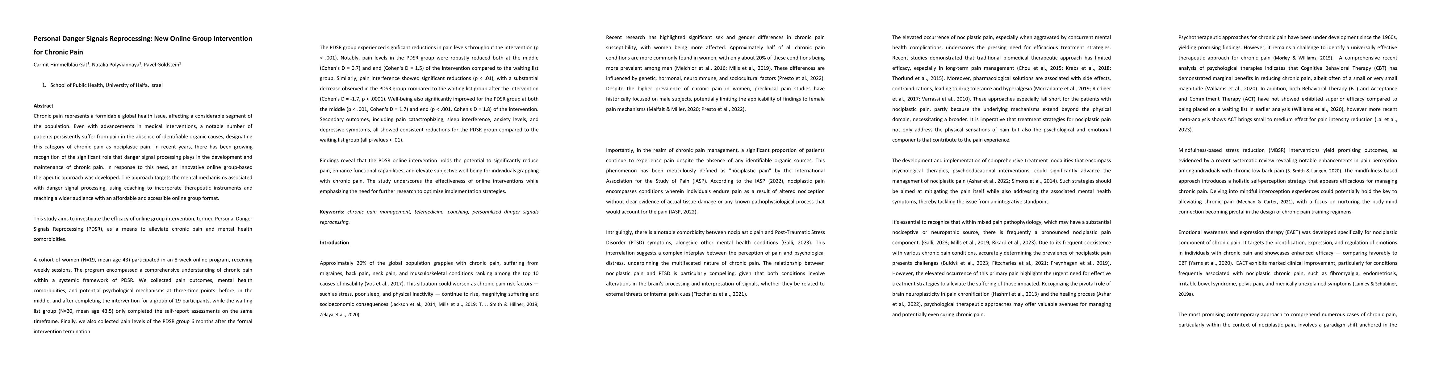 This study introduces the Personal Danger Signals Reprocessing (PDSR) online group intervention for chronic pain, showing significant reductions in pain and mental health comorbidities among participants compared to a control group. Results indicate PDSR is an effective, scalable approach for improving well-being and reducing pain interference in individuals with chronic pain.