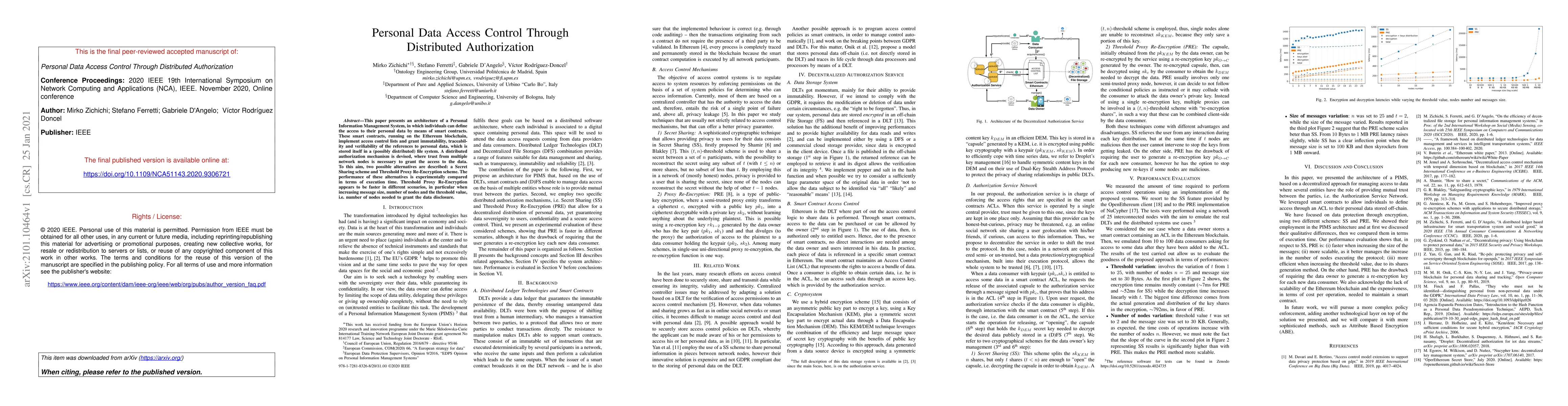 This paper proposes an architecture for a Personal Information Management System using smart contracts on the Ethereum blockchain for data access control. It compares two distributed authorization mechanisms, Secret Sharing and Threshold Proxy Re-Encryption, finding that the latter is faster, especially with larger messages and more nodes.