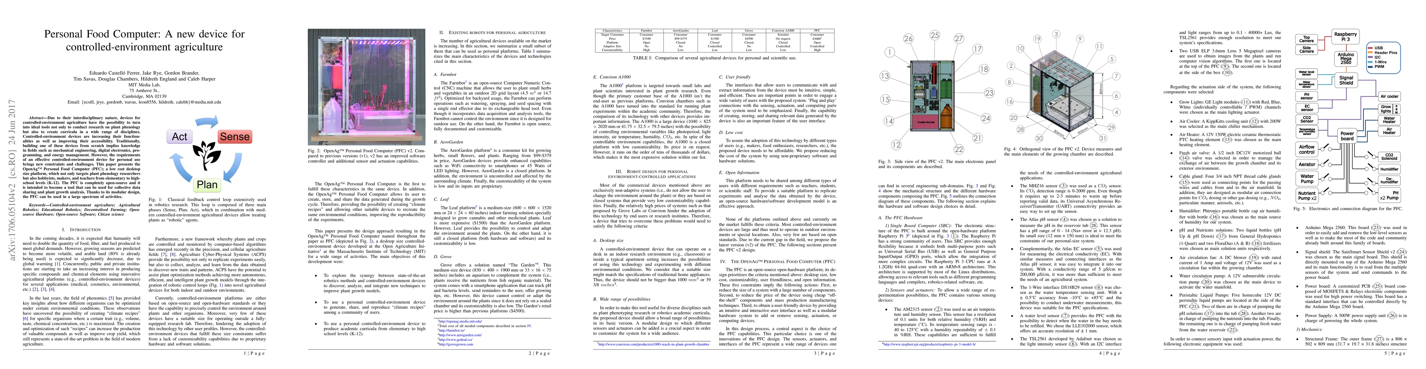 The OpenAg Personal Food Computer (PFC) is a low-cost, open-source desktop platform designed for controlled-environment agriculture, targeting researchers, hobbyists, makers, and K-12 educators for plant phenology studies and educational purposes. Its modular design facilitates collective data sharing and plant growth analysis.