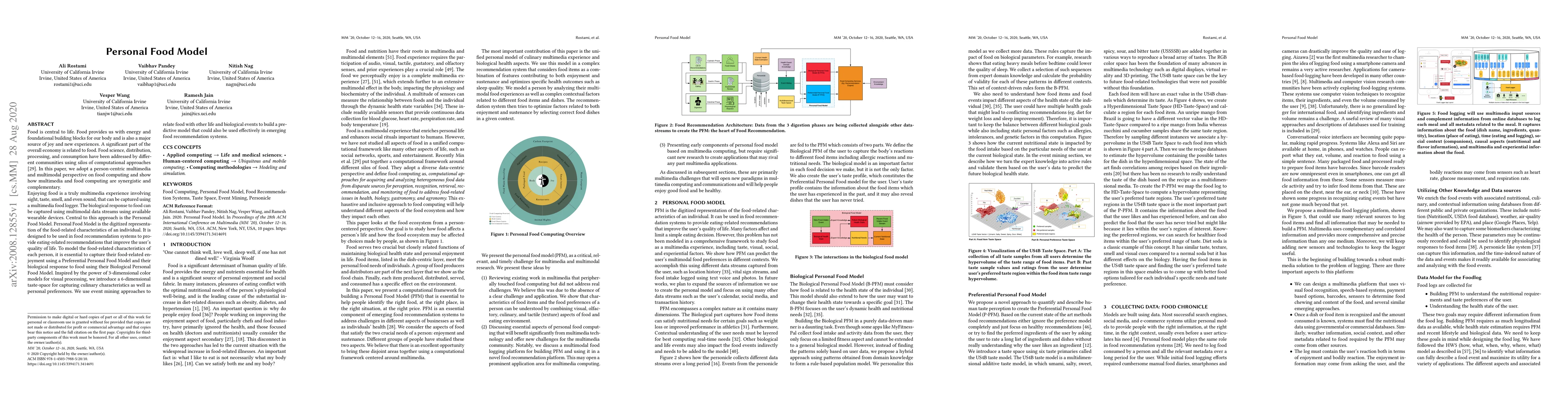 This paper introduces the Personal Food Model, a digitized representation of an individual's food-related characteristics, combining multimedia and multimodal data to enhance food recommendation systems. It uses a 6-dimensional taste-space and event mining to capture culinary preferences and biological responses, aiming to improve users' quality of life through personalized eating recommendations.