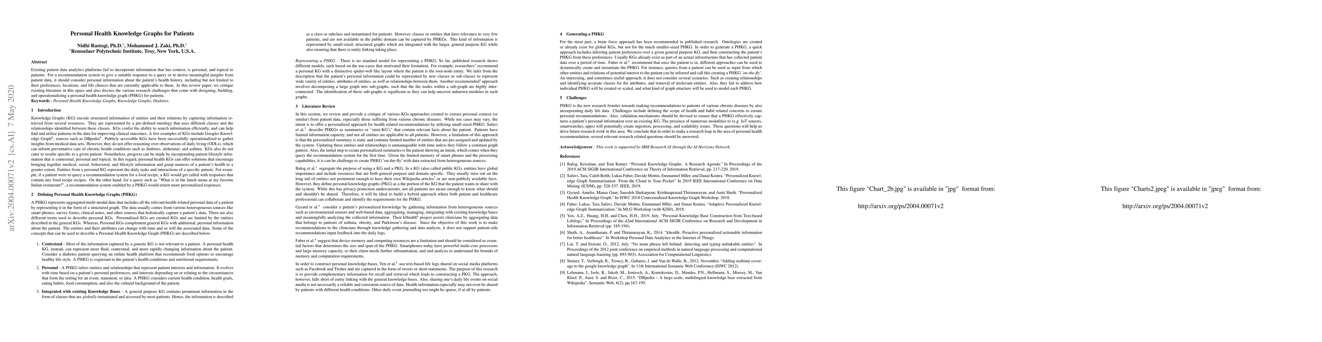 Existing patient data analytics platforms fail to incorporate information that has context, is personal, and topical to patients. For a recommendation system to give a suitable response to a query or to derive meaningful insights from patient data, it should consider personal information about the patient's health history, including but not limited to their preferences, locations, and life choices that are currently applicable to them. In this review paper, we critique existing literature in this space and also discuss the various research challenges that come with designing, building, and operationalizing a personal health knowledge graph (PHKG) for patients.