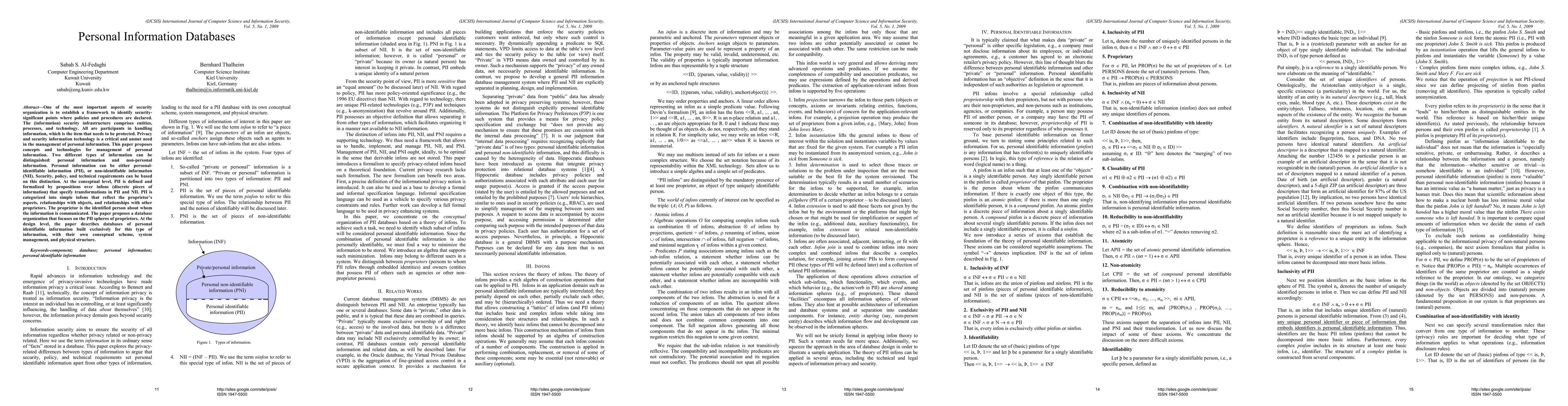 One of the most important aspects of security organization is to establish a framework to identify security significant points where policies and procedures are declared. The (information) security infrastructure comprises entities, processes, and technology. All are participants in handling information, which is the item that needs to be protected. Privacy and security information technology is a critical and unmet need in the management of personal information. This paper proposes concepts and technologies for management of personal information. Two different types of information can be distinguished: personal information and nonpersonal information. Personal information can be either personal identifiable information (PII), or nonidentifiable information (NII). Security, policy, and technical requirements can be based on this distinction. At the conceptual level, PII is defined and formalized by propositions over infons (discrete pieces of information) that specify transformations in PII and NII. PII is categorized into simple infons that reflect the proprietor s aspects, relationships with objects, and relationships with other proprietors. The proprietor is the identified person about whom the information is communicated. The paper proposes a database organization that focuses on the PII spheres of proprietors. At the design level, the paper describes databases of personal identifiable information built exclusively for this type of information, with their own conceptual scheme, system management, and physical structure.