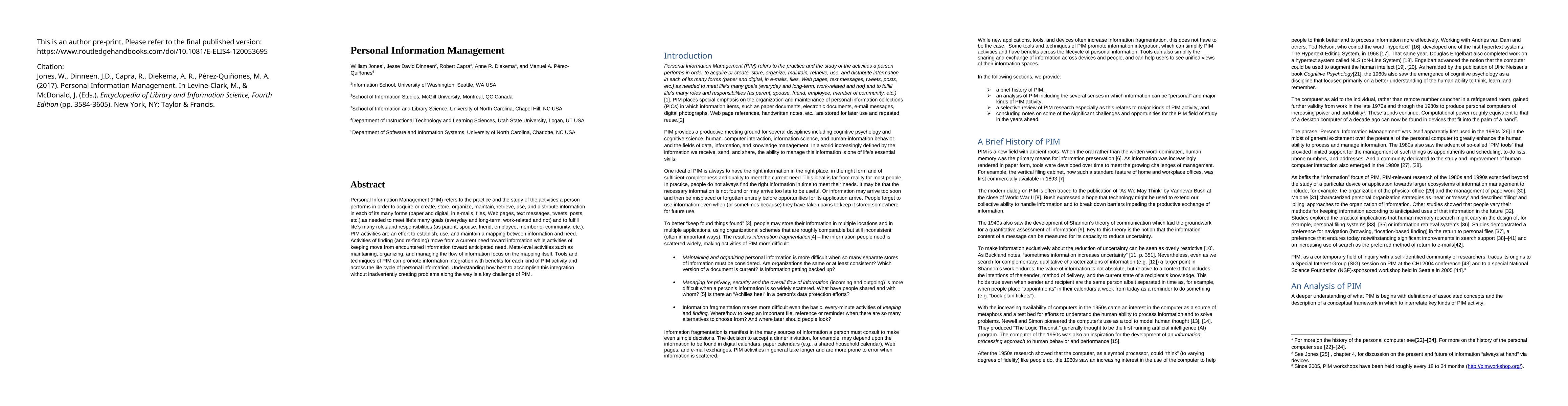 Personal Information Management (PIM) refers to the practice and the study of the activities a person performs in order to acquire or create, store, organize, maintain, retrieve, use, and distribute information in each of its many forms (paper and digital, in e-mails, files, Web pages, text messages, tweets, posts, etc.) as needed to meet life's many goals (everyday and long-term, work-related and not) and to fulfill life's many roles and responsibilities (as parent, spouse, friend, employee, member of community, etc.). PIM activities are an effort to establish, use, and maintain a mapping between information and need. Activities of finding (and re-finding) move from a current need toward information while activities of keeping move from encountered information toward anticipated need. Meta-level activities such as maintaining, organizing, and managing the flow of information focus on the mapping itself. Tools and techniques of PIM can promote information integration with benefits for each kind of PIM activity and across the life cycle of personal information. Understanding how best to accomplish this integration without inadvertently creating problems along the way is a key challenge of PIM.