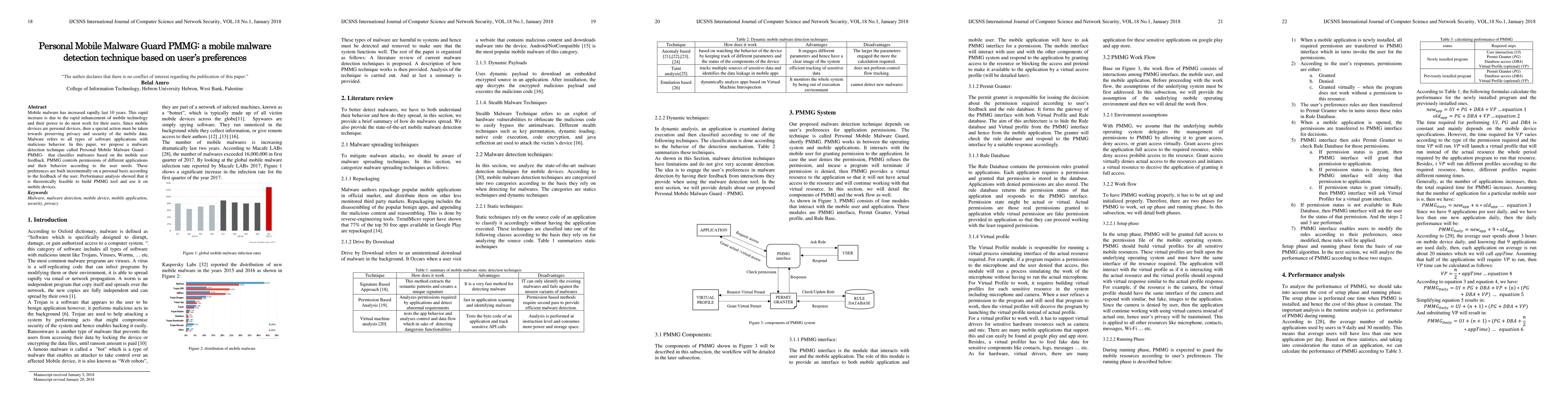 The paper proposes a mobile malware detection technique called Personal Mobile Malware Guard (PMMG) that classifies malware based on user feedback and preferences, dynamically adjusting app permissions and behavior to enhance privacy and security. Performance analysis indicates the feasibility of implementing PMMG on mobile devices.