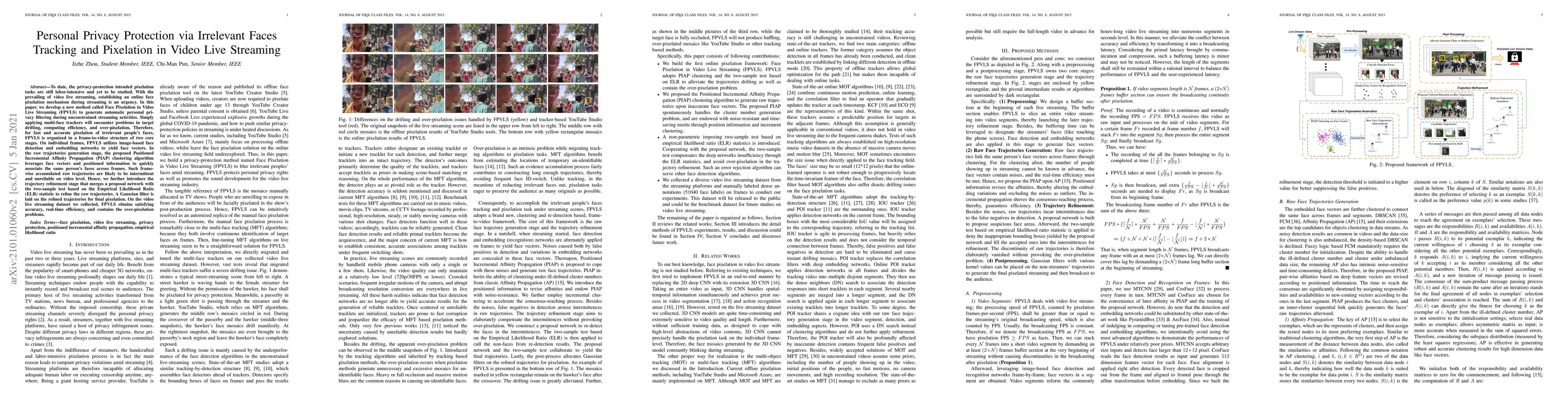 This paper introduces FPVLS, a method for automatic privacy protection in video live streaming by pixelating irrelevant faces. It employs face detection and embedding networks, coupled with a PIAP clustering algorithm and trajectory refinement to ensure accurate and efficient pixelation, addressing issues like target drifting and over-pixelation.