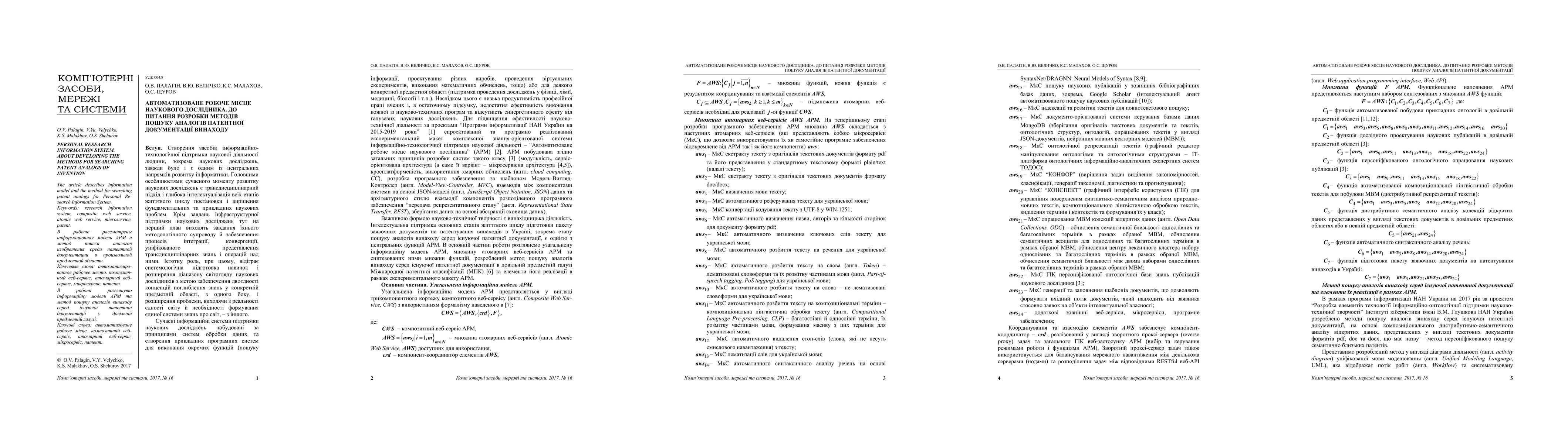 The article describes information model and the method for searching patent analogs for Personal Research Information System.