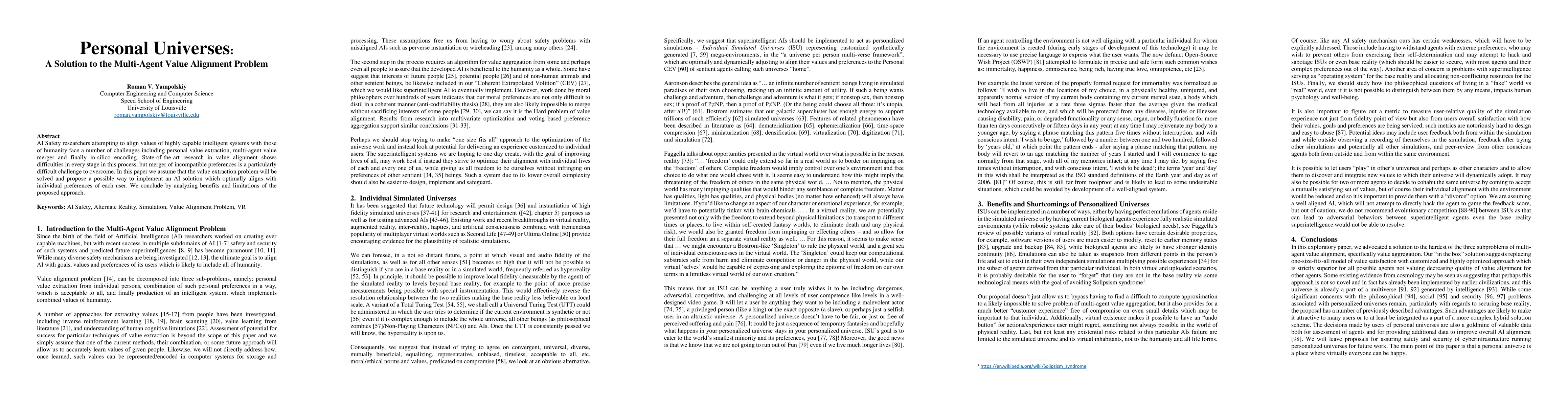 This paper proposes a method called "Personal Universes" to address the multi-agent value alignment problem by optimally aligning AI systems with individual user preferences, focusing on the merger of incompatible preferences. The approach has potential benefits but also notable limitations.