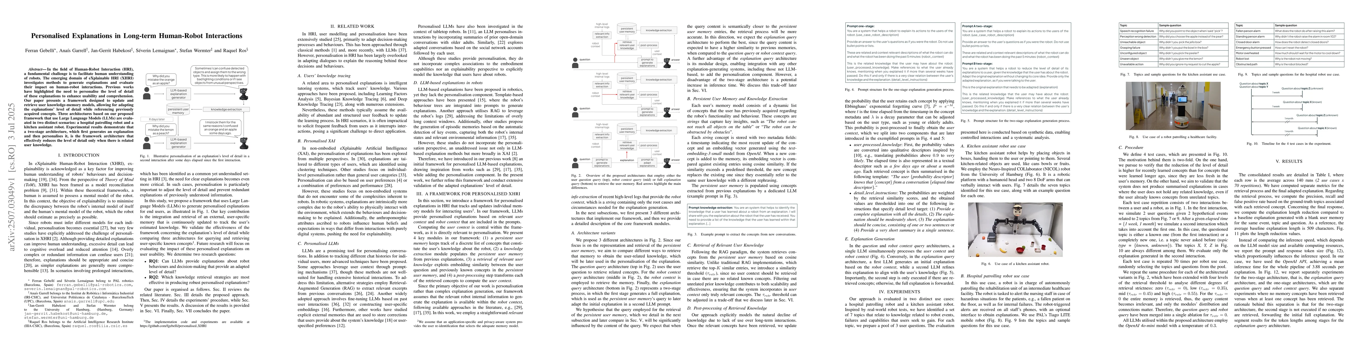 In the field of Human-Robot Interaction (HRI), a fundamental challenge is to facilitate human understanding of robots. The emerging domain of eXplainable HRI (XHRI) investigates methods to generate explanations and evaluate their impact on human-robot interactions. Previous works have highlighted the need to personalise the level of detail of these explanations to enhance usability and comprehension. Our paper presents a framework designed to update and retrieve user knowledge-memory models, allowing for adapting the explanations' level of detail while referencing previously acquired concepts. Three architectures based on our proposed framework that use Large Language Models (LLMs) are evaluated in two distinct scenarios: a hospital patrolling robot and a kitchen assistant robot. Experimental results demonstrate that a two-stage architecture, which first generates an explanation and then personalises it, is the framework architecture that effectively reduces the level of detail only when there is related user knowledge.