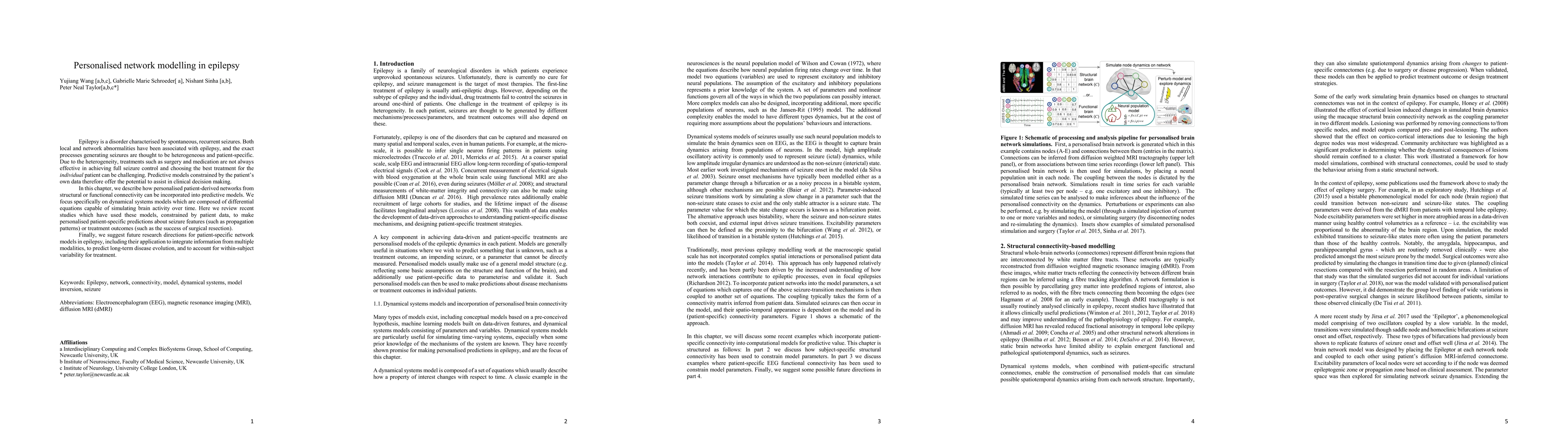 Epilepsy is a disorder characterised by spontaneous, recurrent seizures. Both local and network abnormalities have been associated with epilepsy, and the exact processes generating seizures are thought to be heterogeneous and patient-specific. Due to the heterogeneity, treatments such as surgery and medication are not always effective in achieving full seizure control and choosing the best treatment for the individual patient can be challenging. Predictive models constrained by the patient's own data therefore offer the potential to assist in clinical decision making. In this chapter, we describe how personalised patient-derived networks from structural or functional connectivity can be incorporated into predictive models. We focus specifically on dynamical systems models which are composed of differential equations capable of simulating brain activity over time. Here we review recent studies which have used these models, constrained by patient data, to make personalised patient-specific predictions about seizure features (such as propagation patterns) or treatment outcomes (such as the success of surgical resection). Finally, we suggest future research directions for patient-specific network models in epilepsy, including their application to integrate information from multiple modalities, to predict long-term disease evolution, and to account for within-subject variability for treatment.