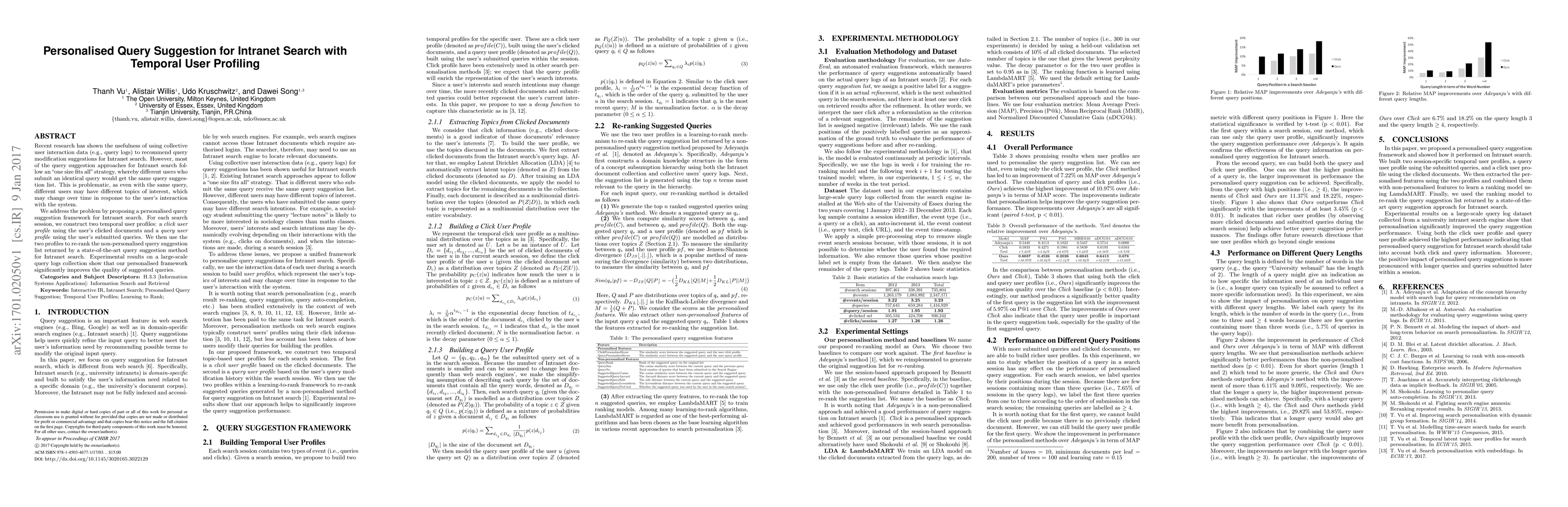 This paper proposes a personalised query suggestion framework for Intranet search that constructs temporal user profiles based on clicked documents and submitted queries, re-ranking suggestions to suit individual users, which significantly enhances query suggestion quality according to experimental results on large query logs.