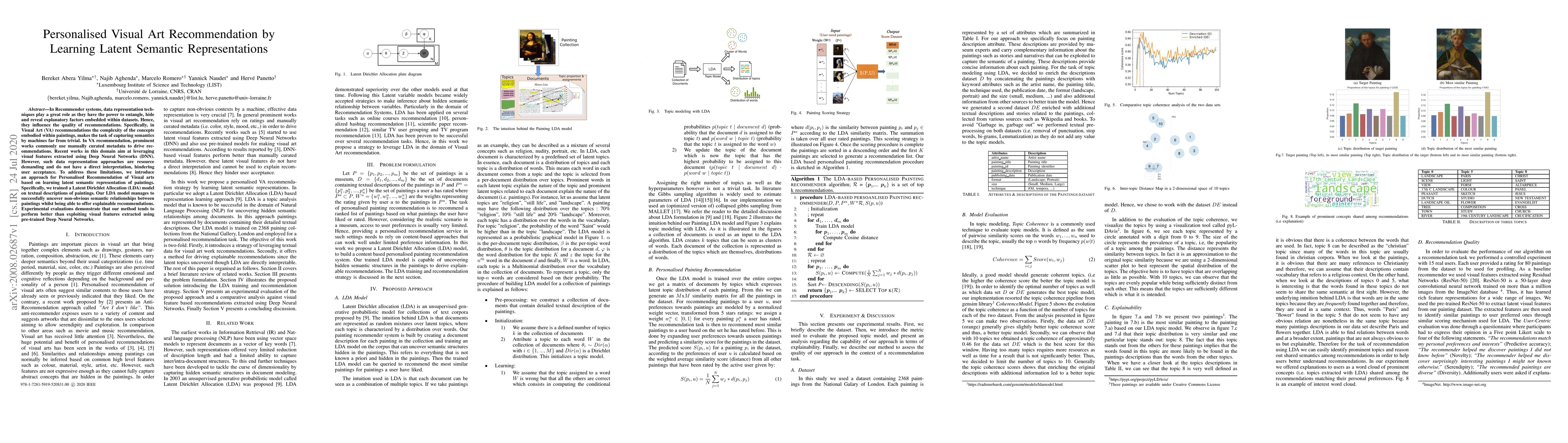 In Recommender systems, data representation techniques play a great role as they have the power to entangle, hide and reveal explanatory factors embedded within datasets. Hence, they influence the quality of recommendations. Specifically, in Visual Art (VA) recommendations the complexity of the concepts embodied within paintings, makes the task of capturing semantics by machines far from trivial. In VA recommendation, prominent works commonly use manually curated metadata to drive recommendations. Recent works in this domain aim at leveraging visual features extracted using Deep Neural Networks (DNN). However, such data representation approaches are resource demanding and do not have a direct interpretation, hindering user acceptance. To address these limitations, we introduce an approach for Personalised Recommendation of Visual arts based on learning latent semantic representation of paintings. Specifically, we trained a Latent Dirichlet Allocation (LDA) model on textual descriptions of paintings. Our LDA model manages to successfully uncover non-obvious semantic relationships between paintings whilst being able to offer explainable recommendations. Experimental evaluations demonstrate that our method tends to perform better than exploiting visual features extracted using pre-trained Deep Neural Networks.