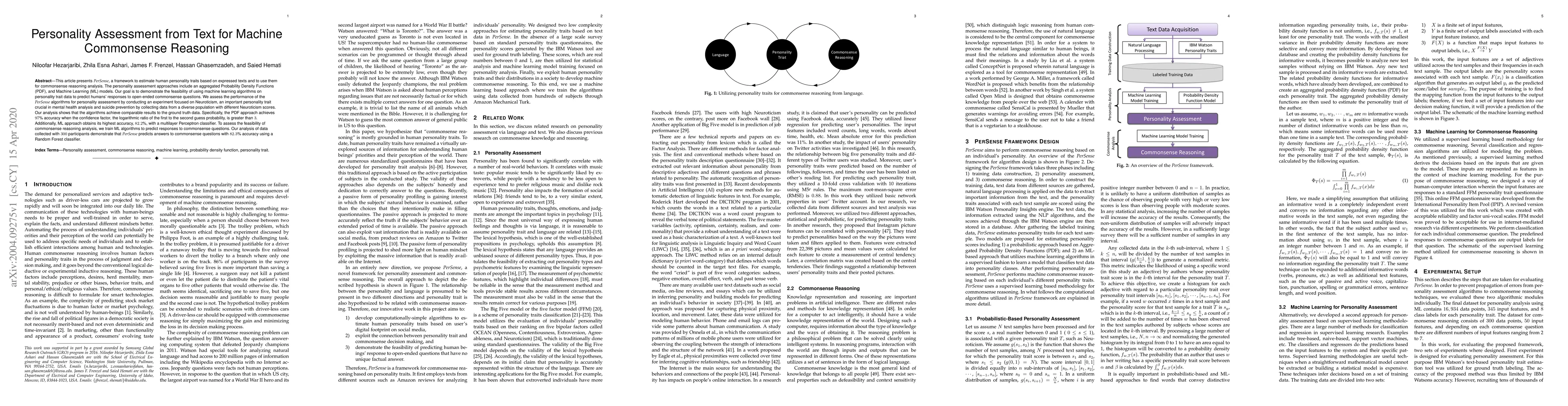 This paper introduces PerSense, a framework for assessing human personality traits from text to aid in commonsense reasoning, employing Probability Density Functions and Machine Learning models. Experiments demonstrate that PerSense can accurately predict Neuroticism traits and commonsense question responses, achieving up to 97% accuracy with PDFs and 82.3% with ML classifiers.