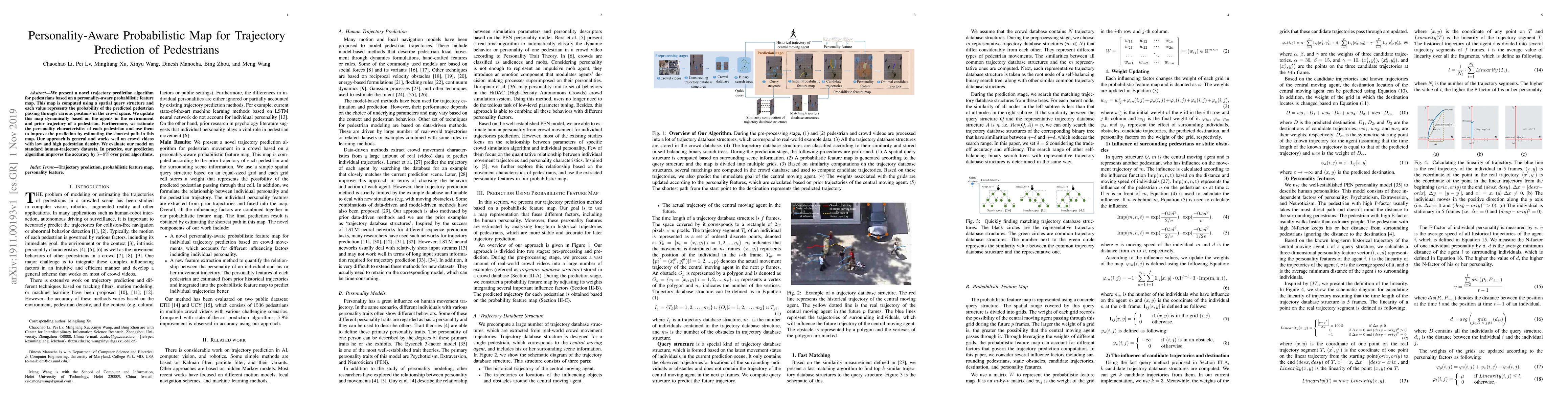 This paper introduces a novel algorithm for predicting pedestrian trajectories using a personality-aware probabilistic map, dynamically updating it based on environmental agents and prior pedestrian behavior. The approach improves prediction accuracy by 5-9% over existing methods, validated on standard datasets.