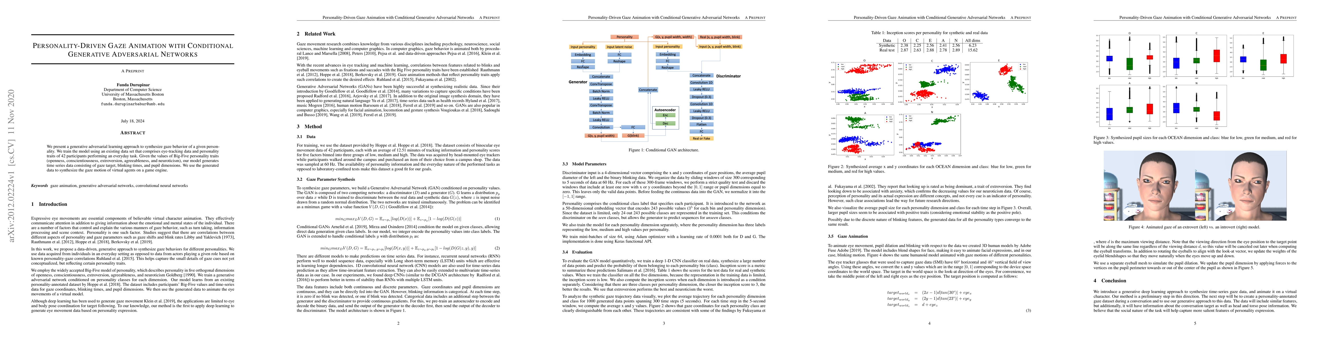 This paper introduces a generative adversarial network (GAN) to create realistic gaze animations based on personality traits. The model synthesizes gaze behavior, including eye movements, blinking, and pupil size, using Big-Five personality traits, and applies the generated data to animate virtual agents in a game engine.