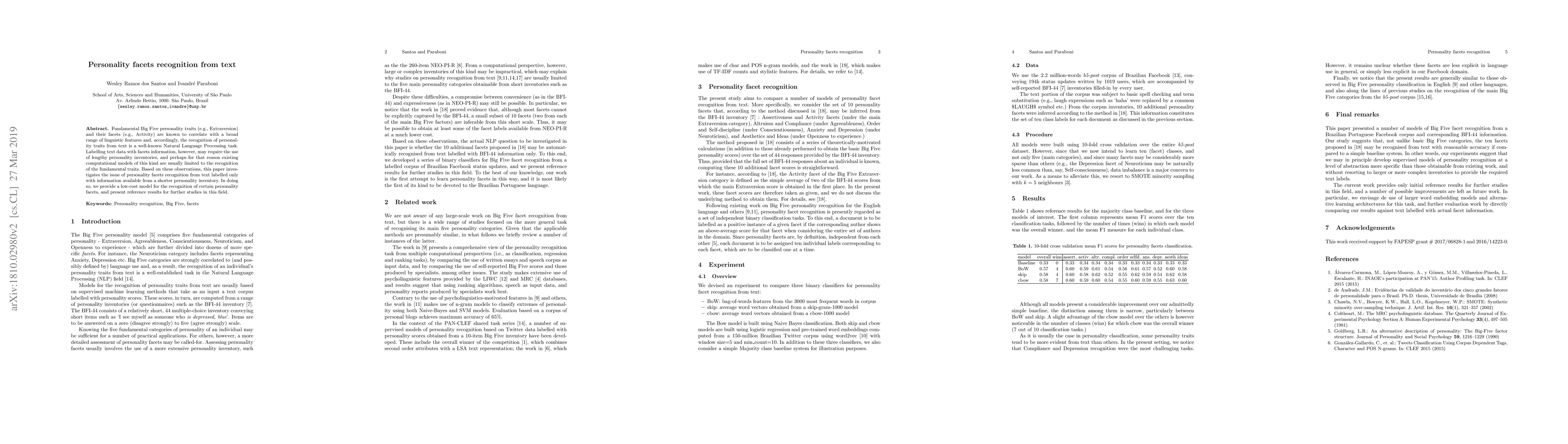 This paper develops a low-cost model for recognizing personality facets from text based on shorter personality inventories, providing a reference framework for future studies in this field.