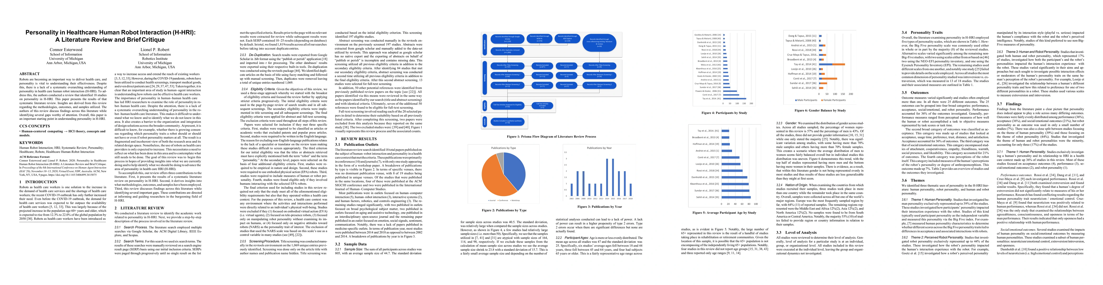 This paper reviews 18 studies on personality in healthcare human-robot interaction (H-HRI), identifying gaps in methodologies and outcomes. The authors highlight the need for further research to better understand the role of personality in enhancing the effectiveness of healthcare robots.