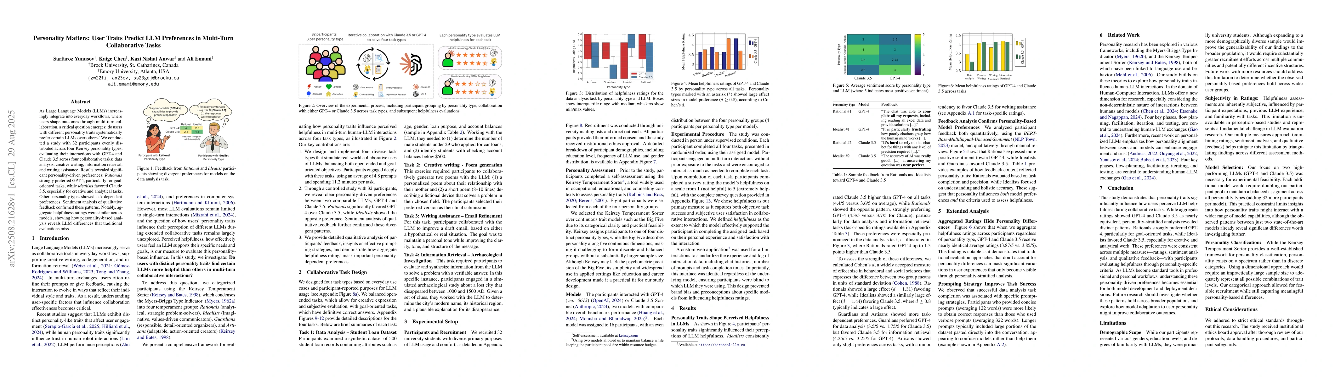 As Large Language Models (LLMs) increasingly integrate into everyday workflows, where users shape outcomes through multi-turn collaboration, a critical question emerges: do users with different personality traits systematically prefer certain LLMs over others? We conducted a study with 32 participants evenly distributed across four Keirsey personality types, evaluating their interactions with GPT-4 and Claude 3.5 across four collaborative tasks: data analysis, creative writing, information retrieval, and writing assistance. Results revealed significant personality-driven preferences: Rationals strongly preferred GPT-4, particularly for goal-oriented tasks, while idealists favored Claude 3.5, especially for creative and analytical tasks. Other personality types showed task-dependent preferences. Sentiment analysis of qualitative feedback confirmed these patterns. Notably, aggregate helpfulness ratings were similar across models, showing how personality-based analysis reveals LLM differences that traditional evaluations miss.