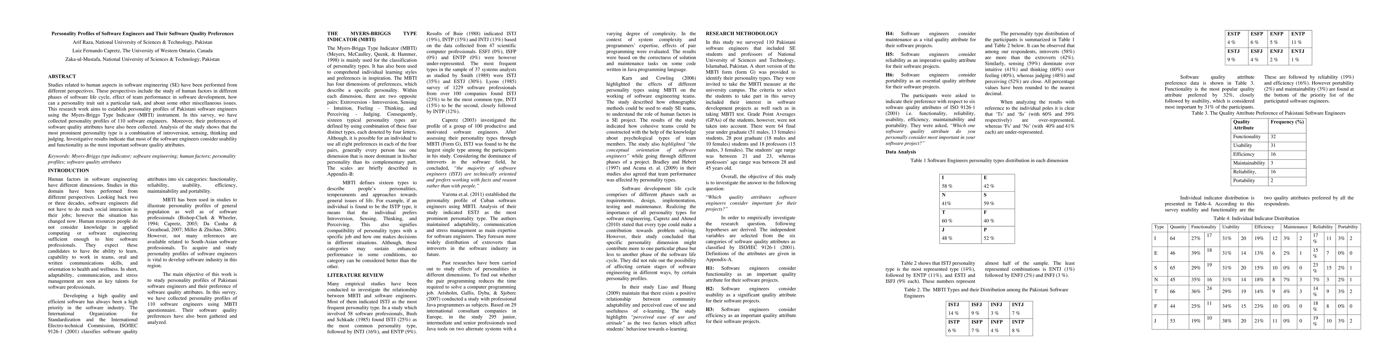 This study examines the personality profiles of Pakistani software engineers using the MBTI, revealing a dominant combination of introversion, sensing, thinking, and judging. Additionally, the survey highlights that engineers prioritize usability and functionality as key software quality attributes.