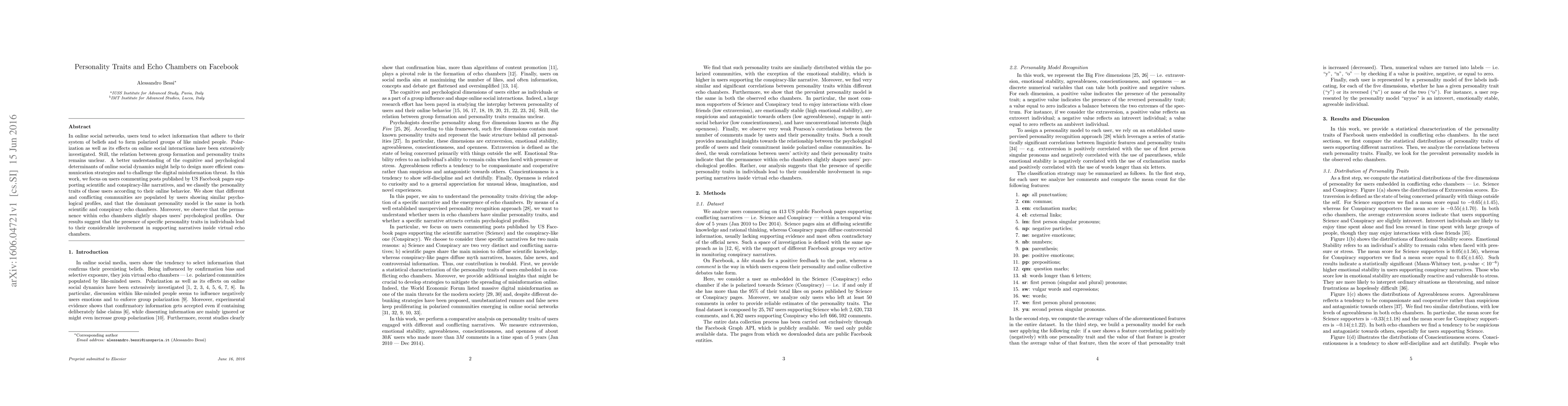 This study investigates the relationship between personality traits and the formation of echo chambers on Facebook, finding that users with similar psychological profiles populate both scientific and conspiracy-based groups, despite their differing beliefs. The research suggests that specific personality traits significantly influence individuals' engagement in online echo chambers.