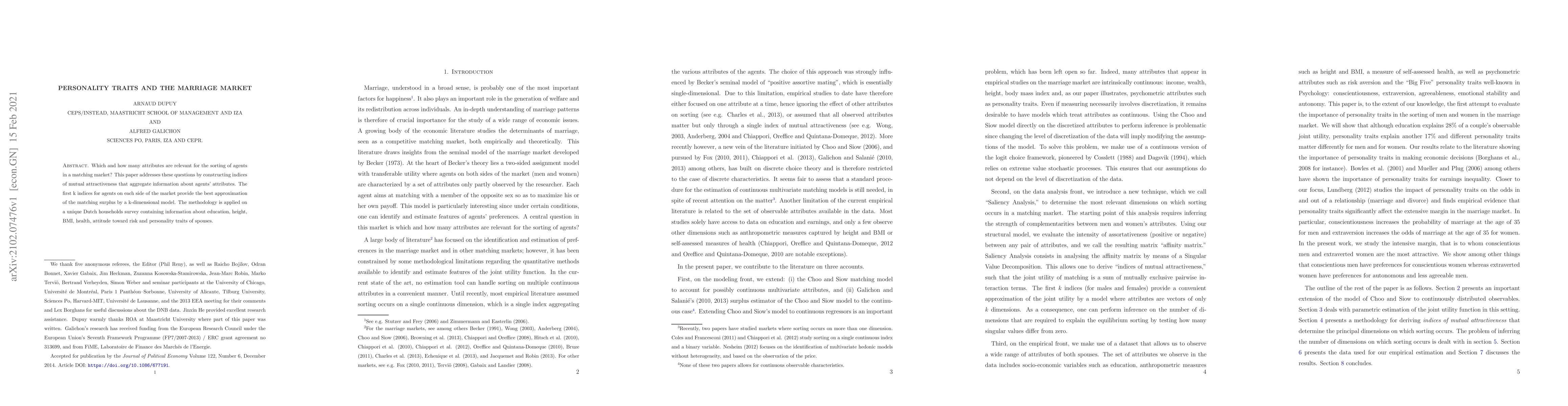 Which and how many attributes are relevant for the sorting of agents in a matching market? This paper addresses these questions by constructing indices of mutual attractiveness that aggregate information about agents' attributes. The first k indices for agents on each side of the market provide the best approximation of the matching surplus by a k-dimensional model. The methodology is applied on a unique Dutch households survey containing information about education, height, BMI, health, attitude toward risk and personality traits of spouses.