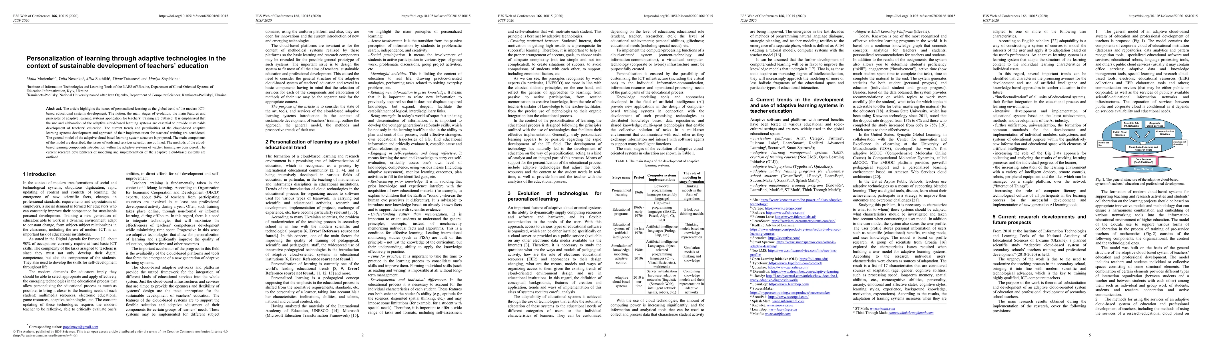 The article highlights the issues of personalized learning as the global trend of the modern ICTbased educational systems development. The notion, the main stages of evolution, the main features and principles of adaptive learning systems application for teachers training are outlined. It is emphasized that the use and elaboration of the adaptive cloud-based learning systems are essential to provide sustainable development of teachers education. The current trends and peculiarities of the cloud-based adaptive learning systems development and approach of their implementation for teachers training are considered. The general model of the adaptive cloud-based learning system structure is proposed. The main components of the model are described; the issues of tools and services selection are outlined. The methods of the cloudbased learning components introduction within the adaptive systems of teacher training are considered. The current research developments of modeling and implementation of the adaptive cloud-based systems are outlined.