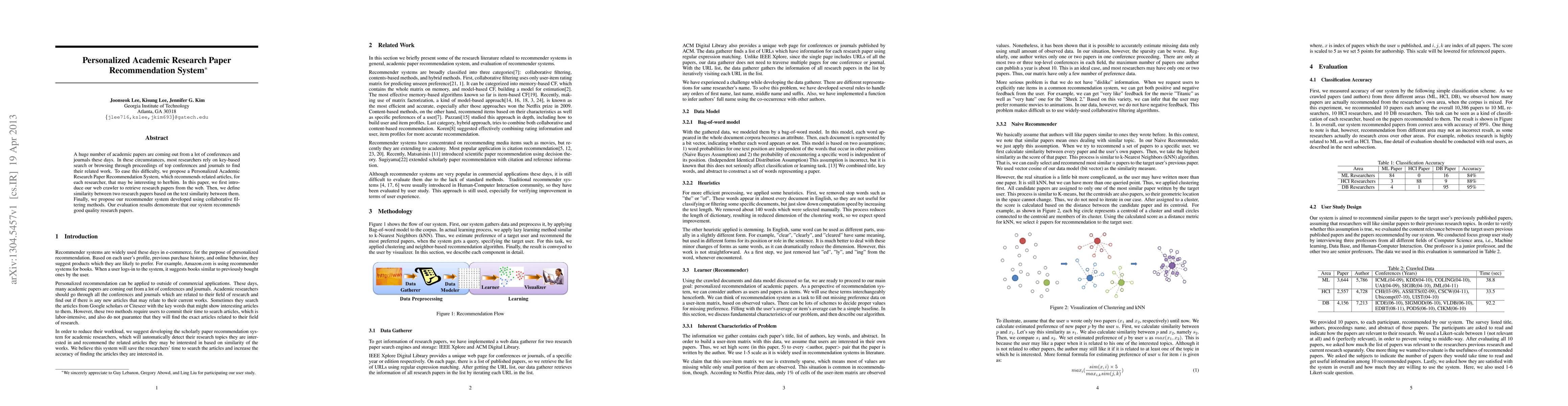 This paper proposes a Personalized Academic Research Paper Recommendation System to assist researchers in finding relevant papers. The system uses a web crawler to retrieve papers and employs collaborative filtering to recommend related articles based on text similarity. Evaluation shows the system effectively recommends high-quality research papers.