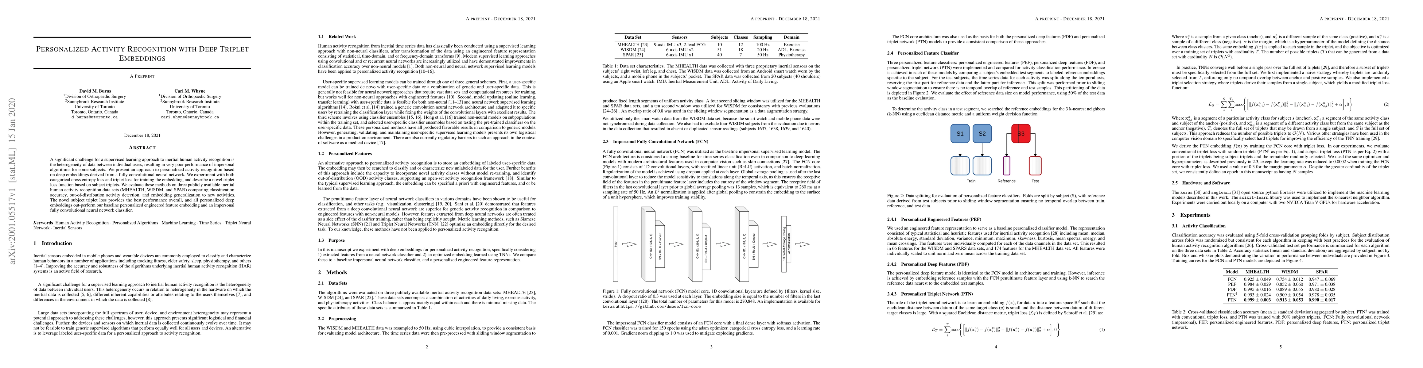 This paper proposes personalized activity recognition using deep triplet embeddings from a convolutional neural network, addressing data heterogeneity issues. The novel triplet loss function based on subject triplets outperforms other methods in classification accuracy and generalization, outperforming both personalized engineered features and an impersonal classifier.